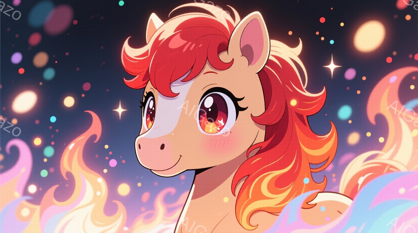 明るいオレンジ色のたてがみが特徴的なユニコーンが描かれています。彼女はピンクのチークと輝く大きな目を持っており、穏やかな笑顔を浮かべています。背景は、燃えるような炎と、きらめく星のような光の粒子で満たされており、ファンタジーで活気に満ちた雰囲気を作り出しています。