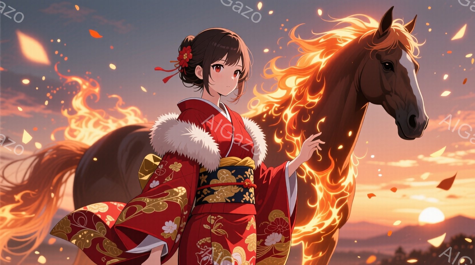 黒髪を後ろで結い上げた女性は、黒地に炎のような模様が描かれた着物と白いファーの襟が特徴的な衣装を身につけています。彼女は穏やかな笑顔を浮かべ、白く輝く馬の首元にそっと手を添えています。背景にはぼんやりとした光の粒子が舞い、幻想的で温かい雰囲気を醸し出しています。