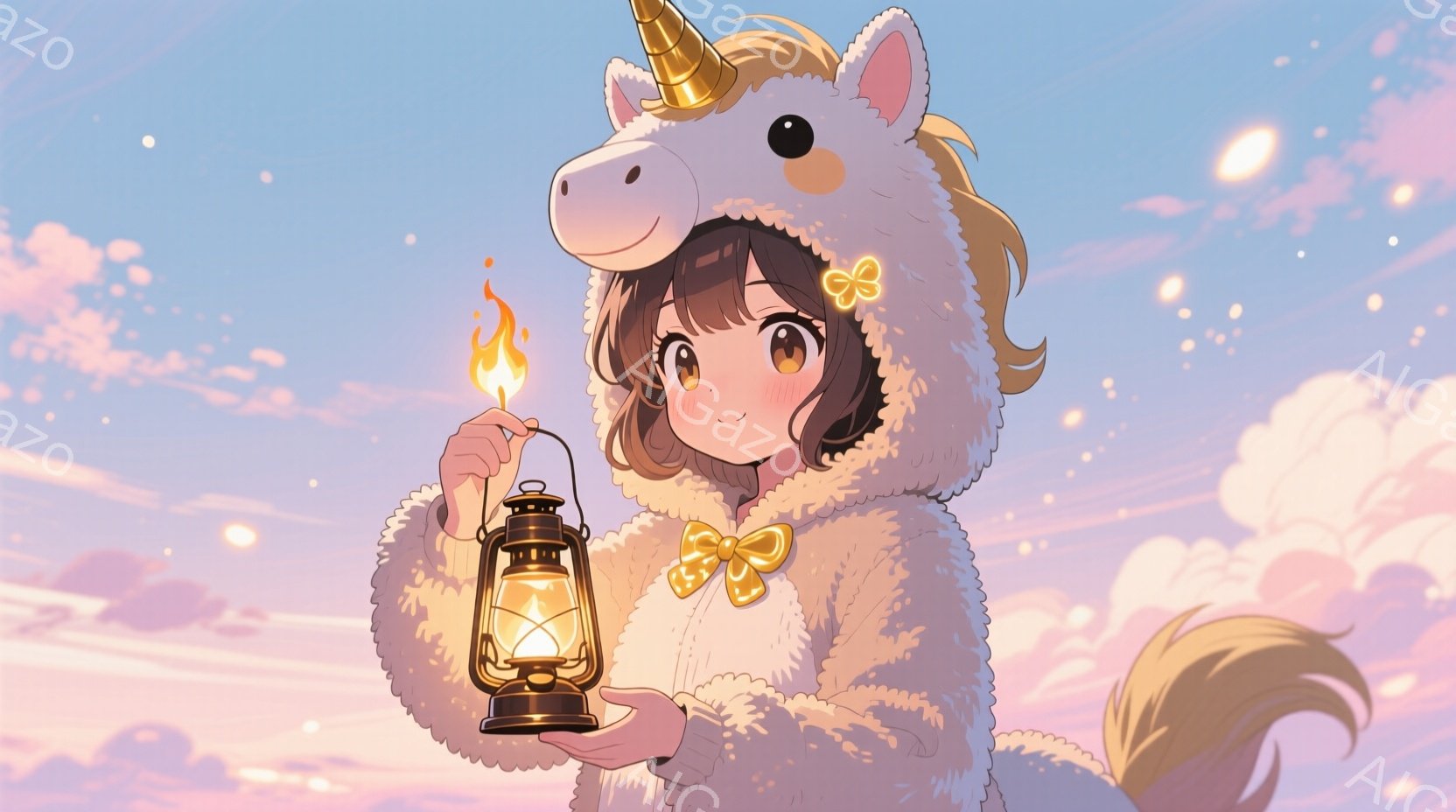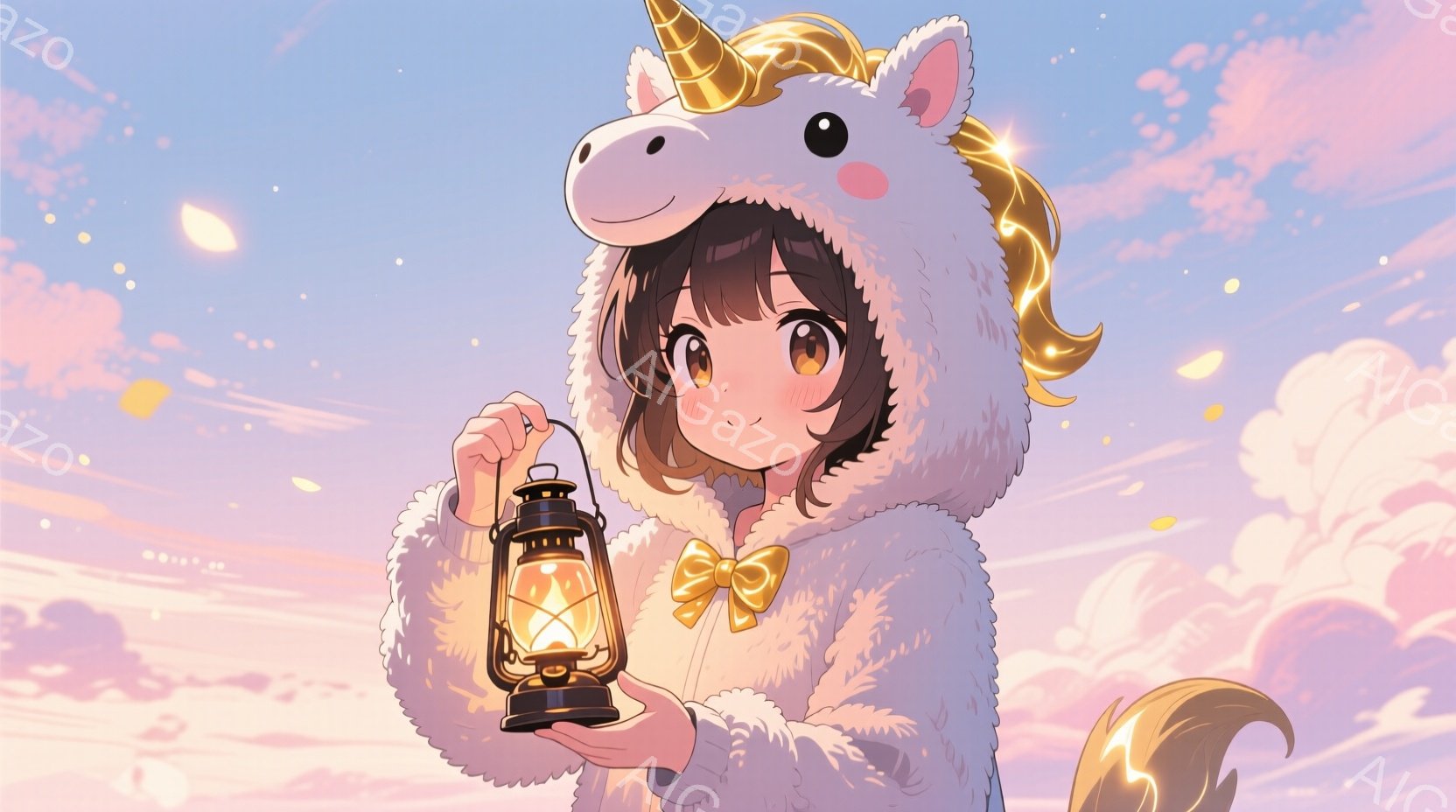 明るい茶髪の少女が、ユニコーンの着ぐるみ姿で描かれている。彼女は金色のリボンと黄色いセーターを着て、片手に灯りを灯したランタンを持っている。背景は夕焼けのようなピンクとオレンジのグラデーションで、空には雲が浮かび、全体的に温かく幻想的な雰囲気である。