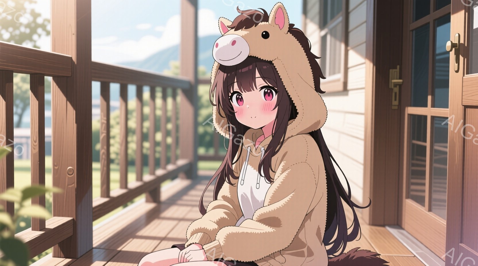 長い黒髪の少女が、白いユニコーンのパーカーを着て、バルコニーに座っています。彼女は少し微笑んでおり、リラックスした雰囲気です。背景には建物と緑豊かな自然が見え、晴れた日の穏やかな光が差し込んでいます。