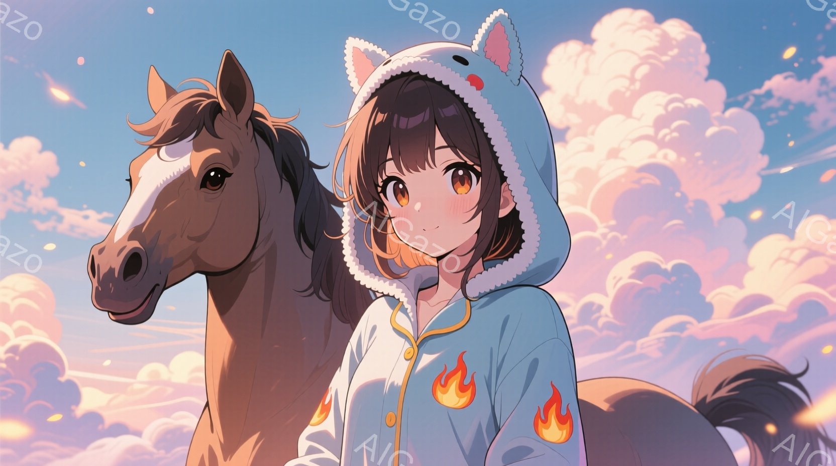 茶色の馬が右側に描かれ、左側にはフード付きの薄い青色のジャケットを着た若い女性がいます。女性は黒髪で、髪は肩まで伸びています。空はピンクと水色の雲で覆われ、全体的に穏やかで夢のような雰囲気です。