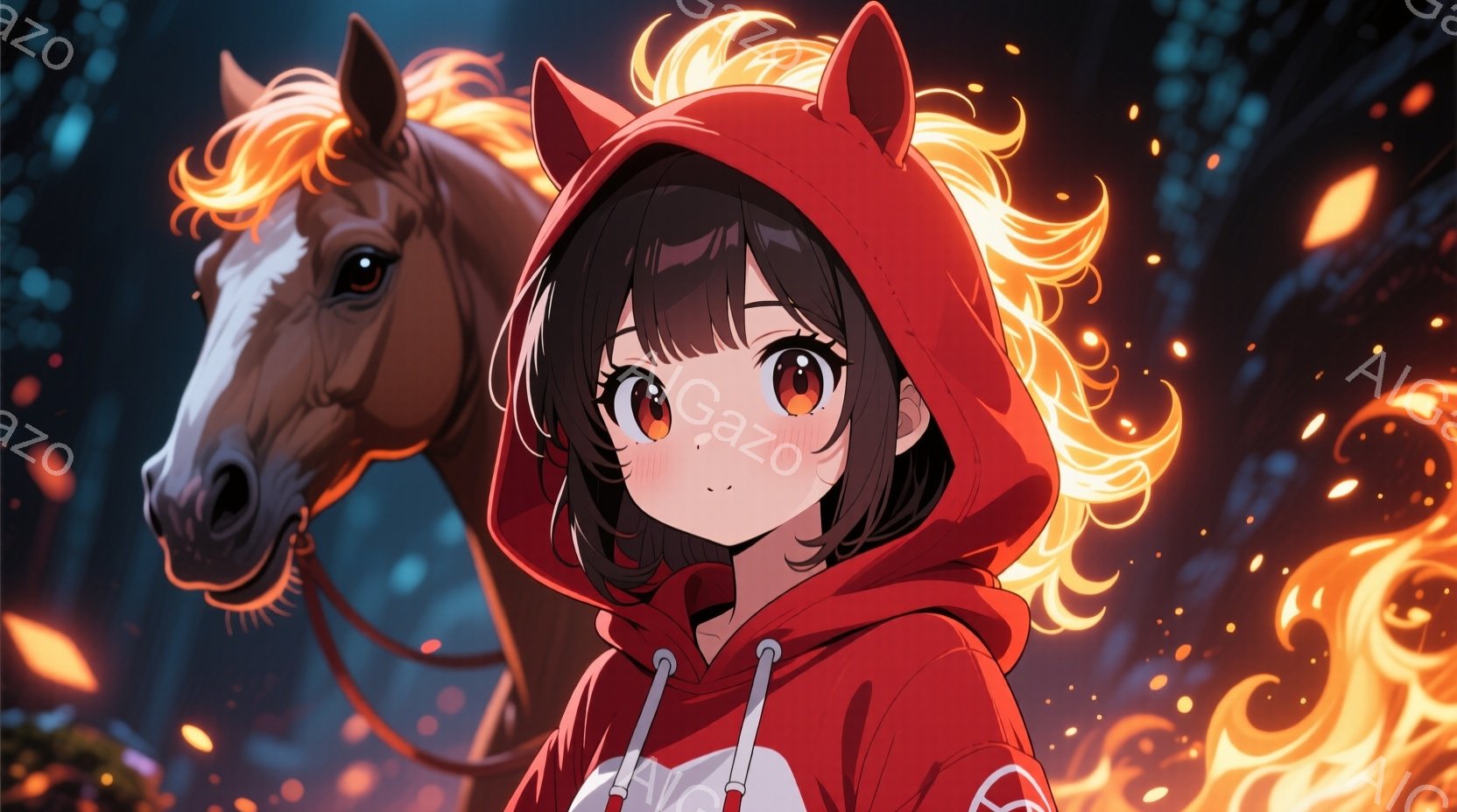 赤色のフード付きセーターを着た若い女性が描かれています。彼女はダークブラウンの髪を持ち、明るい赤色の瞳で、わずかに微笑んでいます。背景には、燃え盛る炎と、ぼやけた馬のシルエットがあり、ダイナミックで熱狂的な雰囲気を作り出しています。