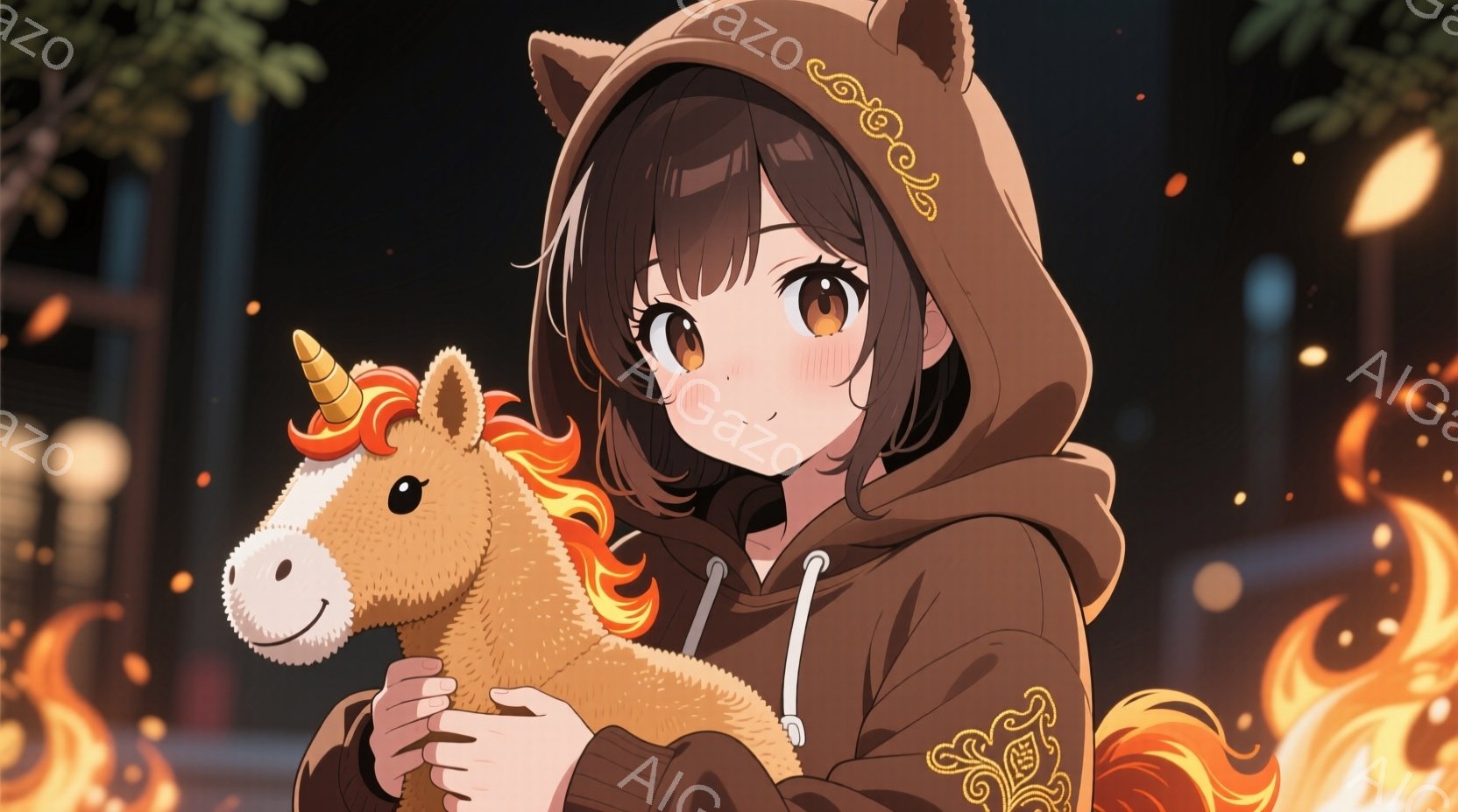 茶髪の少女が、茶色のパーカーを着て、抱きぬいぐるみを持っています。彼女は前を向いて微笑んでおり、パーカーのフードには可愛らしい耳が付いています。背景は燃え盛る炎と、ぼやけた光の粒子で構成され、幻想的で少し神秘的な雰囲気を作り出しています。