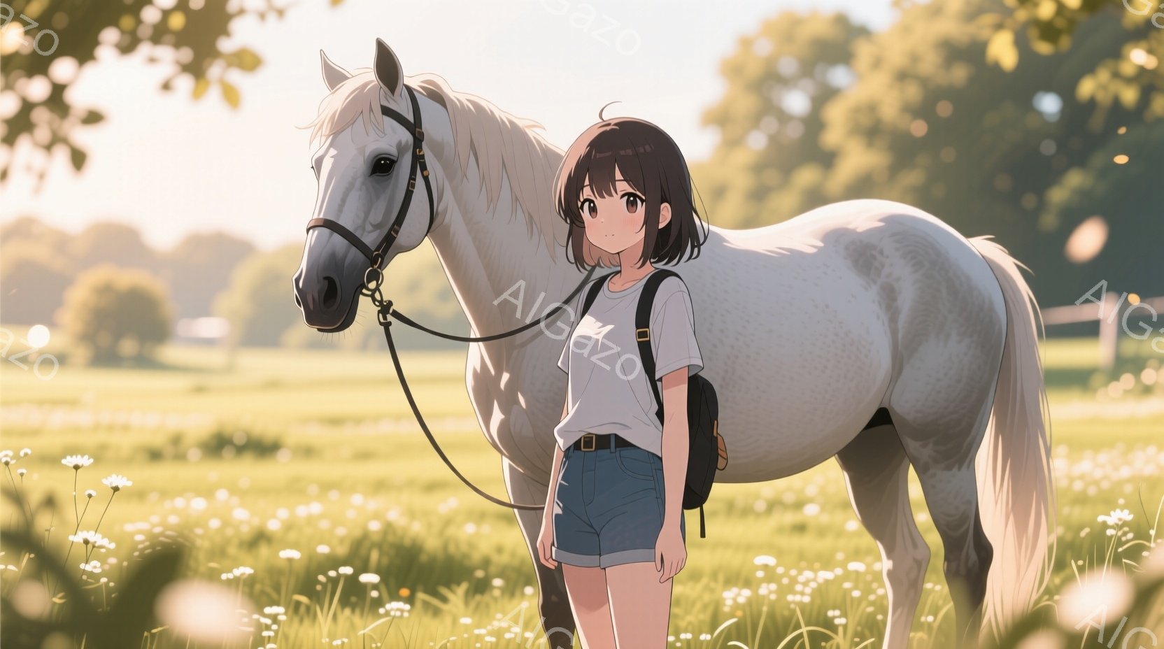 若い女性が白い馬の隣に立っている。彼女は白いTシャツとデニムのショートパンツを身に着け、短い黒髪は肩のあたりでカットされている。背景には緑豊かな草原、白い花々、そして遠くに見える建物があり、晴れた日の穏やかな雰囲気を醸し出している。