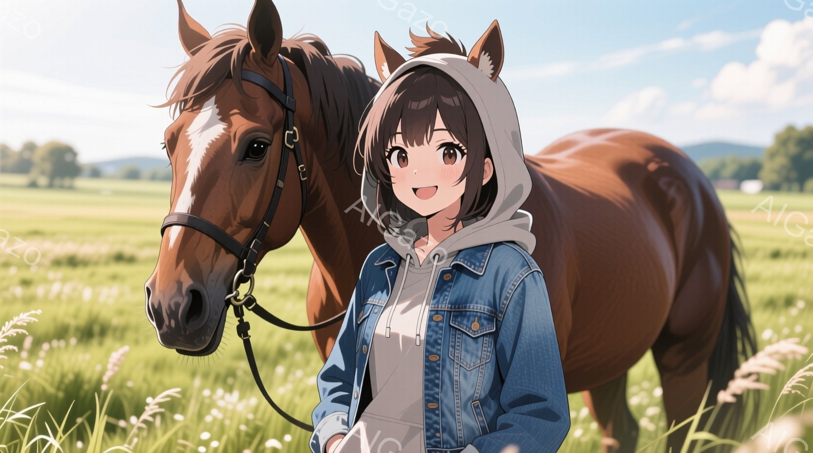 若い女性が茶色の馬の隣に立っており、白いTシャツにデニムジャケット、フード付きのセーターを着ています。彼女は明るい笑顔で、少し上目遣いをしています。背景には緑豊かな草原と遠くの山々が見え、晴れた日の穏やかな雰囲気が漂っています。
