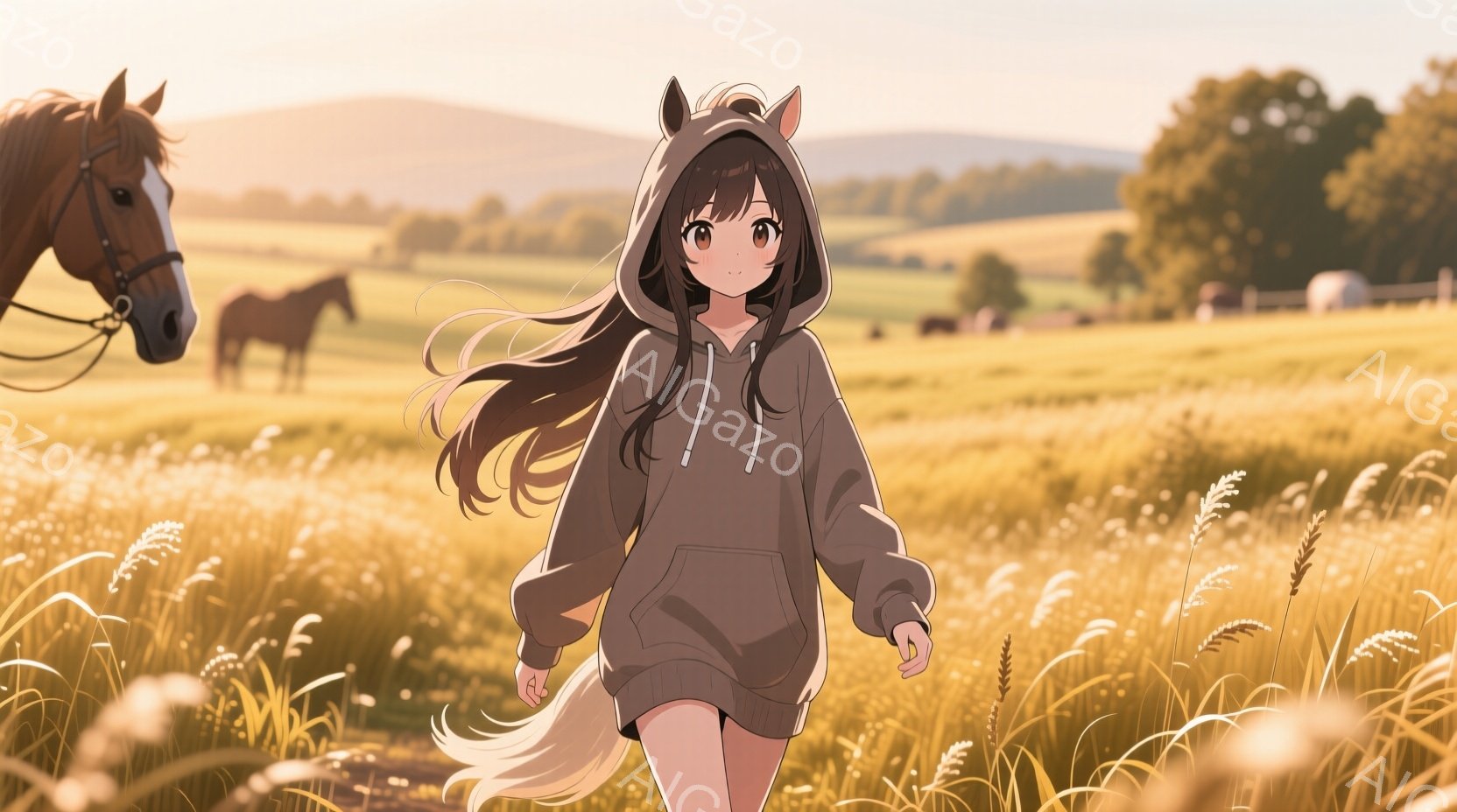 長い茶髪の少女が、麦畑の中を駆けている。オーバーサイズのパーカーと短いズボンを着用し、少し伏し目がちで、どこか憂いを帯びた表情をしている。背景には緑豊かな丘陵地帯が広がり、夕焼けのような暖かい光が全体を包み込み、穏やかで少し寂しげな雰囲気を醸し出している。
