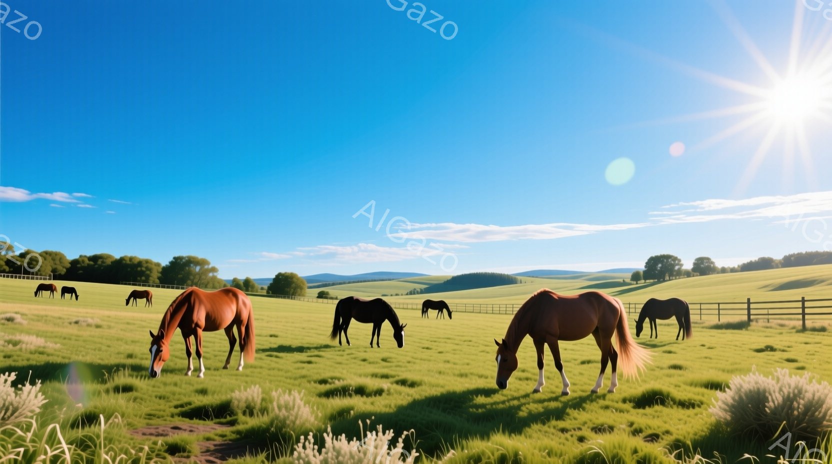 広大な緑の牧場には、数頭の栗色の馬が草を食んでいます。背景には穏やかな丘陵地帯が広がり、遠くには木々が生い茂り、小さな赤い建物が見えます。空は晴れ渡り、太陽が輝き、のどかで平和な雰囲気を醸し出しています。