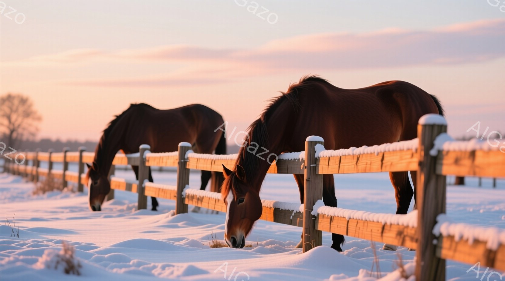 雪に覆われた野原で、2頭の栗色の馬がフェンスの下で草を食んでいます。馬たちは頭を下げ、穏やかな様子で冬の静寂を楽しむように見えます。背景には、遠くに見える木々と、夕焼けのような暖かい光が広がり、平和で穏やかな冬の雰囲気を醸し出しています。
