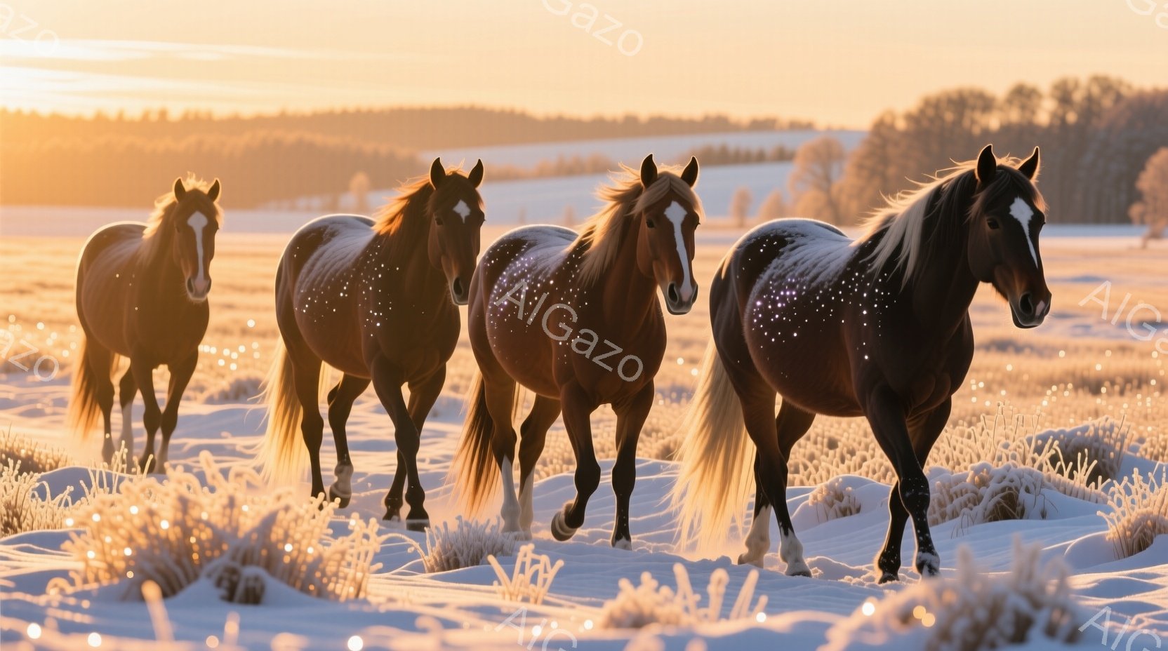 凍てつく雪原に、黒い馬が一頭佇んでいます。夕焼けが背景を赤く染め上げ、雪面にはオレンジ色の光が差し込み、幻想的な光景を作り出しています。馬は少し首を下げ、遠くを見つめるような姿勢で、静寂と力強さを感じさせます。