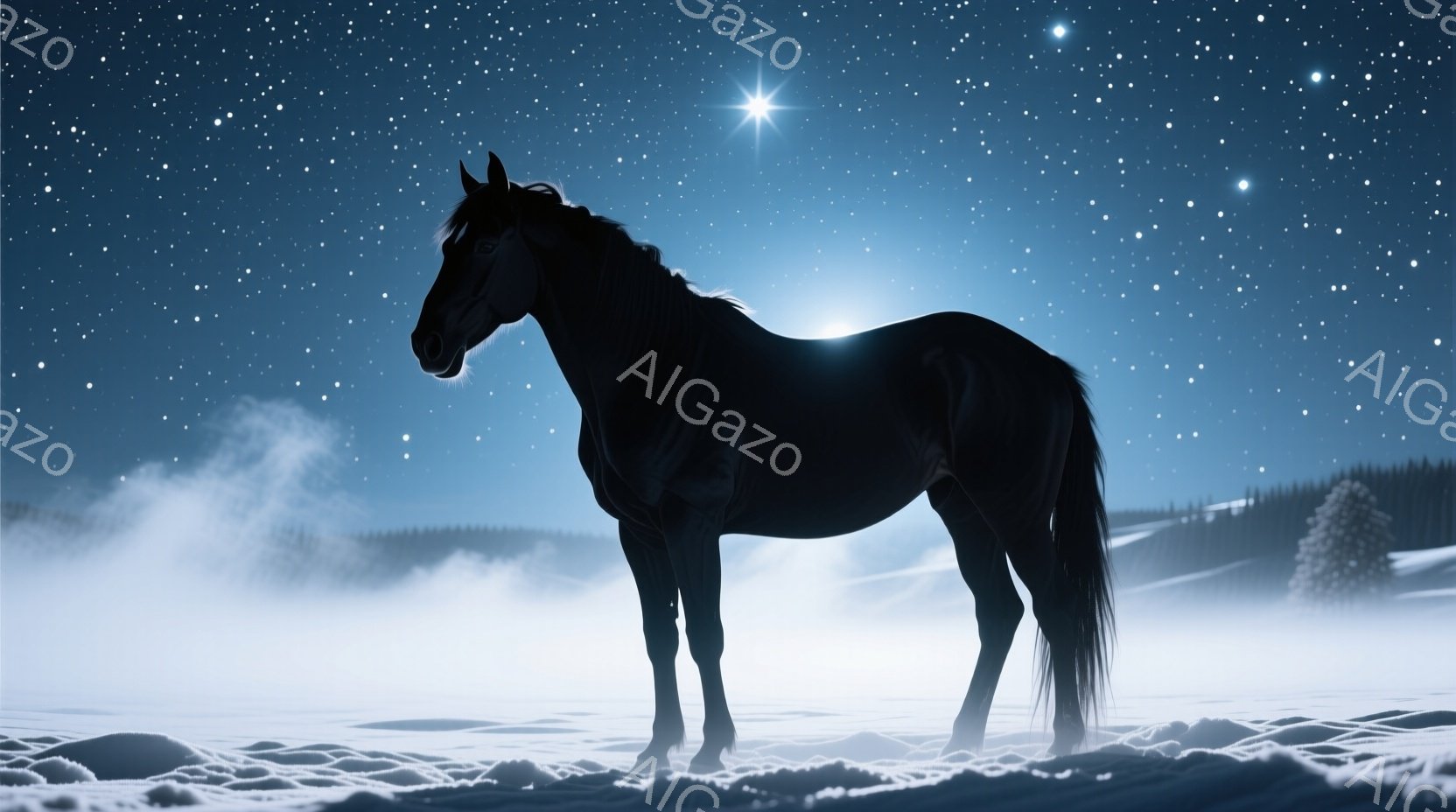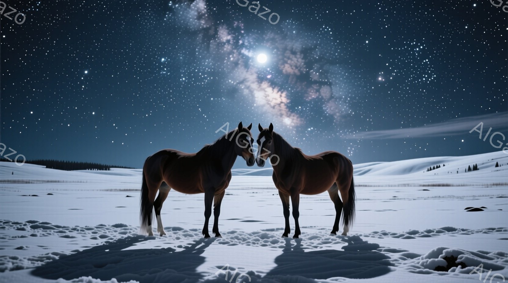 真っ白な雪原に二頭の栗色の馬が並んで立っている。夜空には満月が輝き、星々が煌めき、馬達の影が雪の上に長く伸びている。背景には遠くに見える森林が広がり、静寂で幻想的な雰囲気が漂っている。