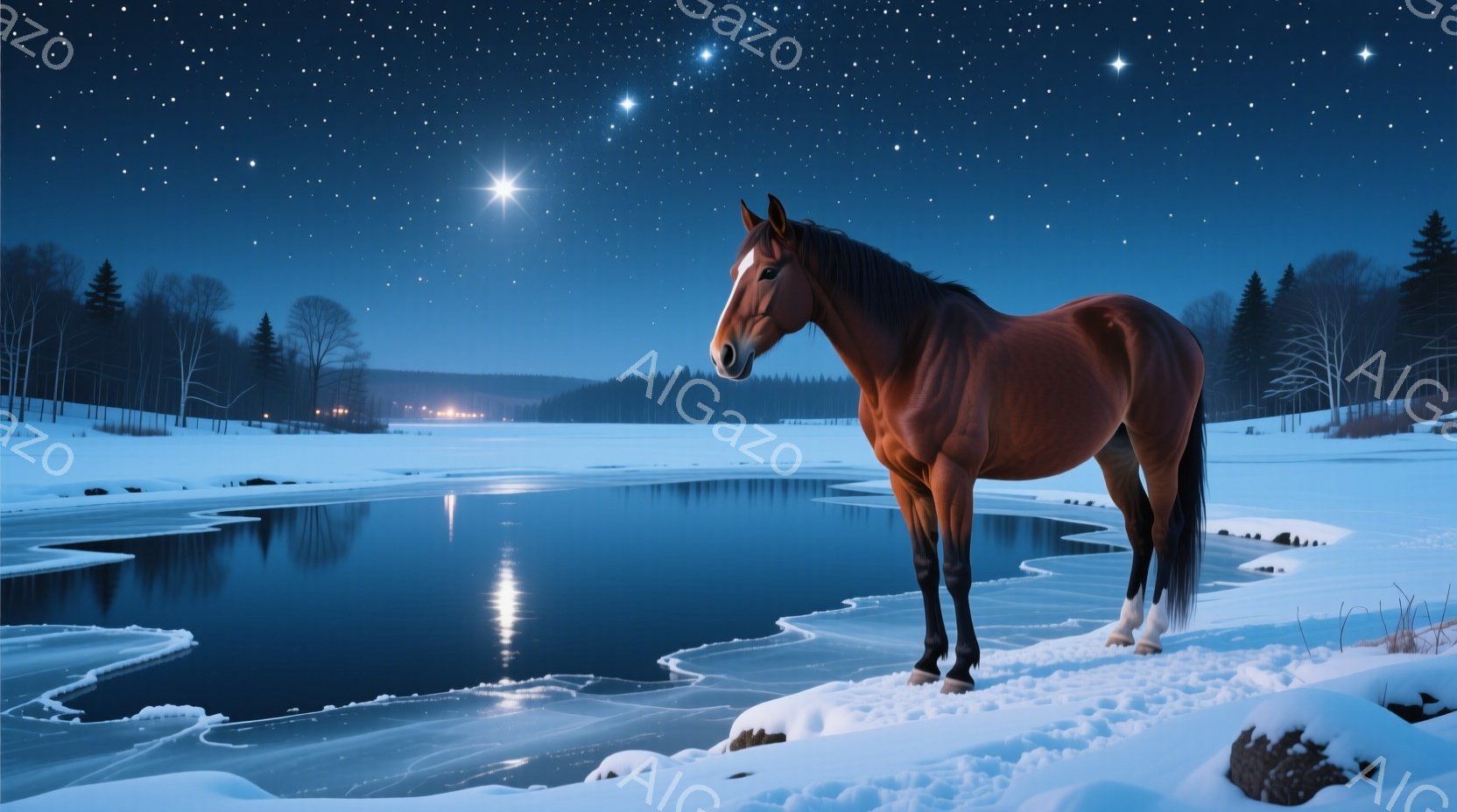 深い雪の上に堂々と立つ茶色の馬が印象的だ。凍った湖面が馬を映し出し、遠くには暗い森と夜空に輝く星々が広がる。全体的に静寂で神秘的な雰囲気で、冬の夜の幻想的な光景が目に浮かぶ。