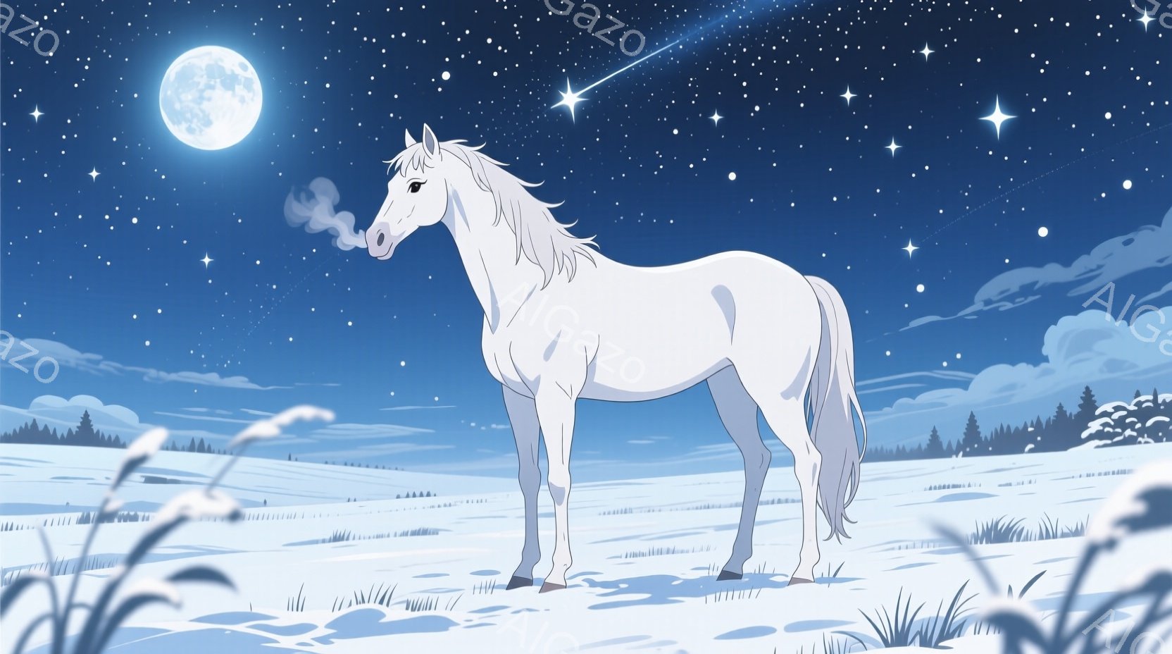 白い馬が雪景色の中、静かに立っている。背景には、遠くに見える針葉樹の森と、満月と星が輝く夜空が広がり、幻想的な雰囲気を醸し出している。雪原には少しだけ草が生えており、夜空には彗星のような光跡が描かれている。