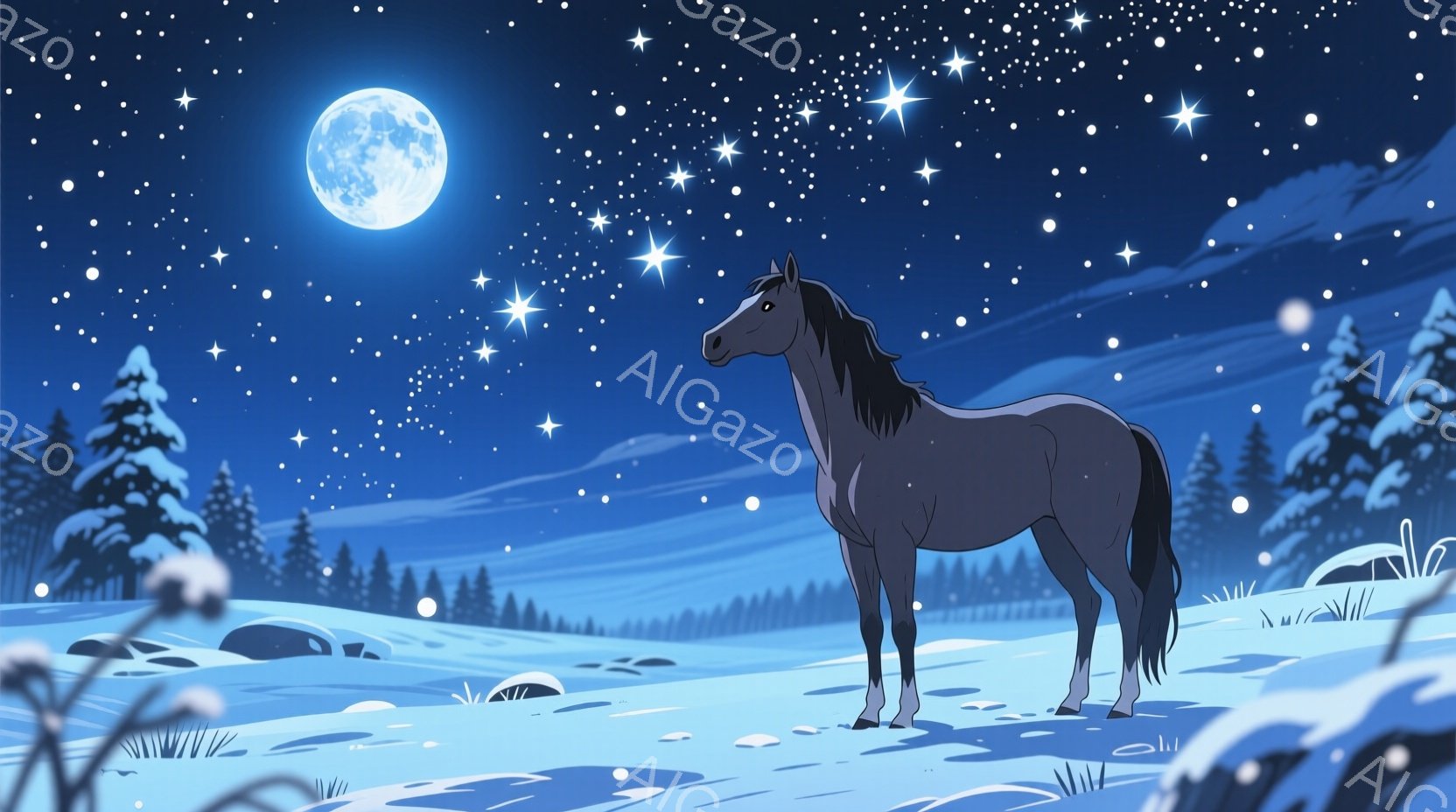 白い雪景色の中に、一頭の灰色っぽい馬が立っている。背景には暗い緑の針葉樹林と、月明かりに照らされた雪に覆われた丘が見え、夜空には無数の星と天の川が輝いている。全体的に静かで神秘的な雰囲気が漂い、冬の夜の美しさを表現している。