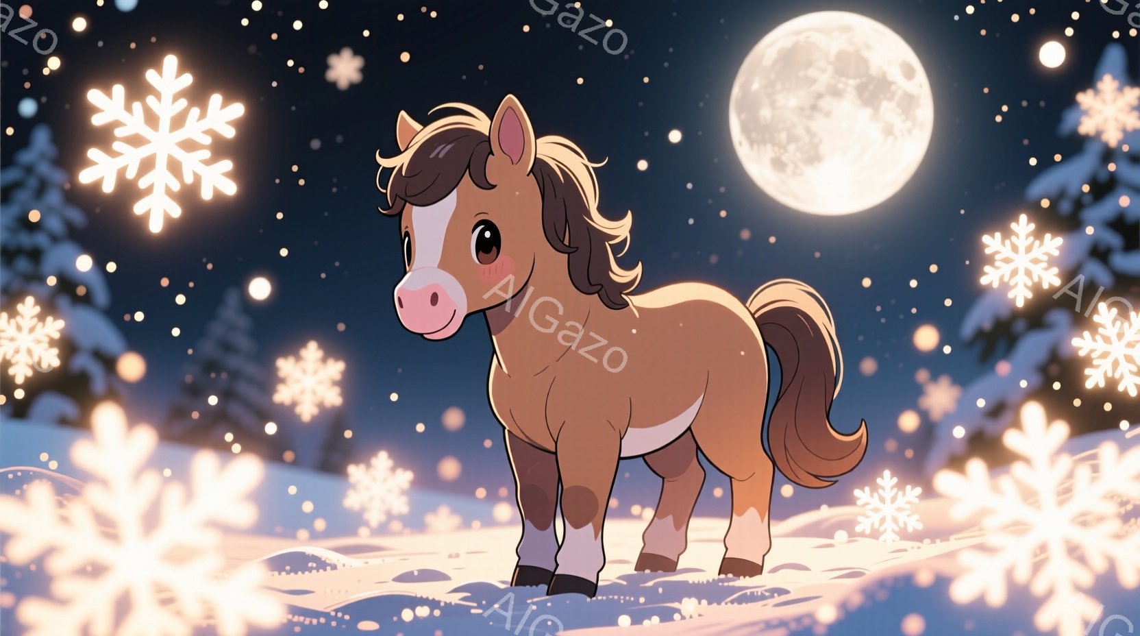 明るい茶色の馬が雪景色の中に立っています。その馬は茶色のたてがみと尾を持っており、少し微笑んでいるように見えます。背景には雪の降る森と、丸く光る満月があり、幻想的な冬の雰囲気を醸し出しています。