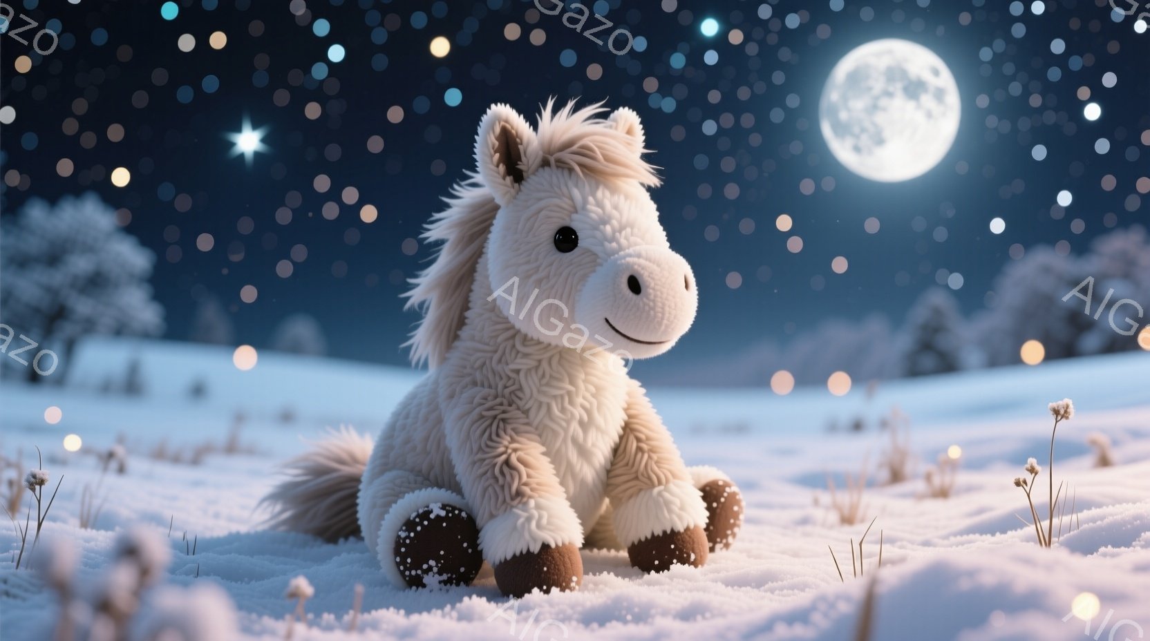 白い毛並みの愛らしい子馬が雪景色の中に座っています。背景には、月明かりが照らす冬の森が広がり、あたりは穏やかな雪が降っています。全体的に、幻想的で温かい雰囲気を醸し出しており、雪景色と子馬のコントラストが印象的です。