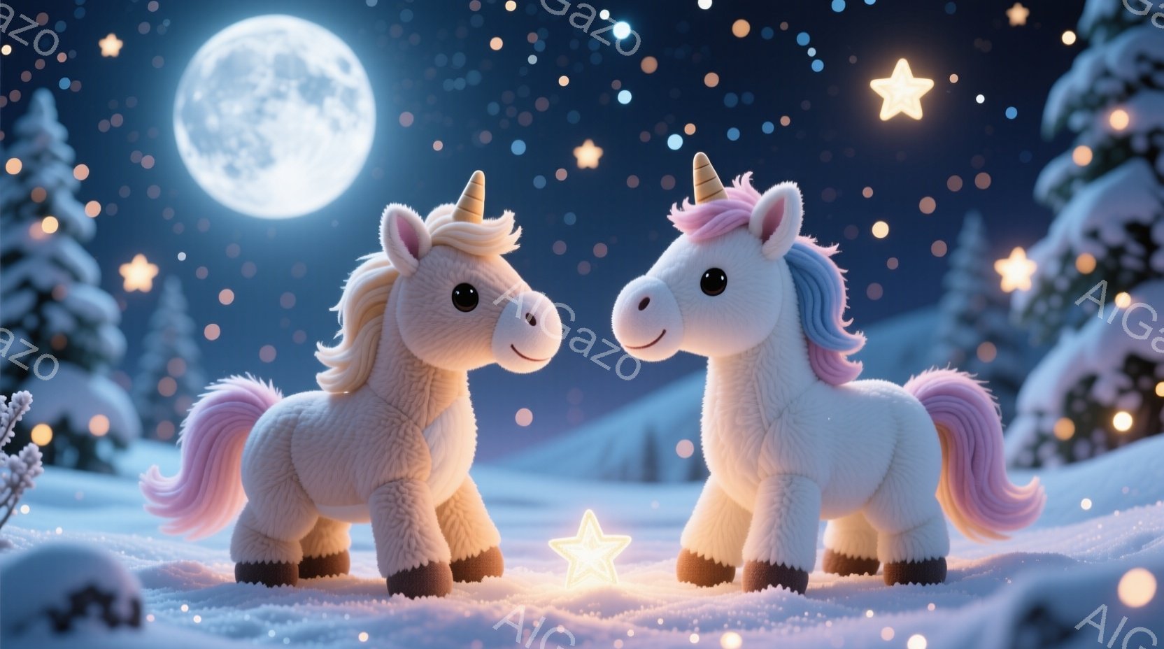 白い毛並みを持つユニコーンが、紫とピンクのグラデーションがかったたてがみと、虹色の瞳でこちらを見つめています。ふんわりとした毛並みと優しい表情は、穏やかで夢幻的な雰囲気を醸し出しています。背景は暗い夜空で、様々な色の星々が輝き、ファンタジーの世界観を強調しています。