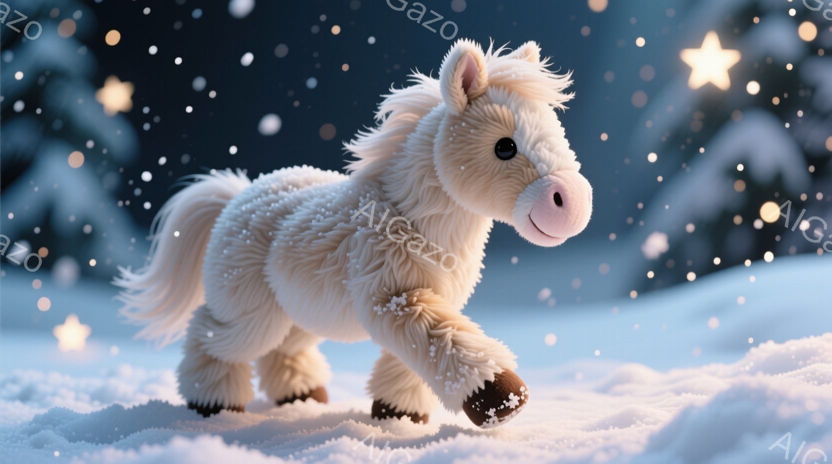 白い毛並みのポニーが雪原を歩いている様子が捉えられています。ポニーは優しい表情で、まるで雪景色の中を散歩しているかのように見えます。背景にはぼやけた木々と、きらめく雪が舞っており、幻想的で温かい雰囲気を醸し出しています。