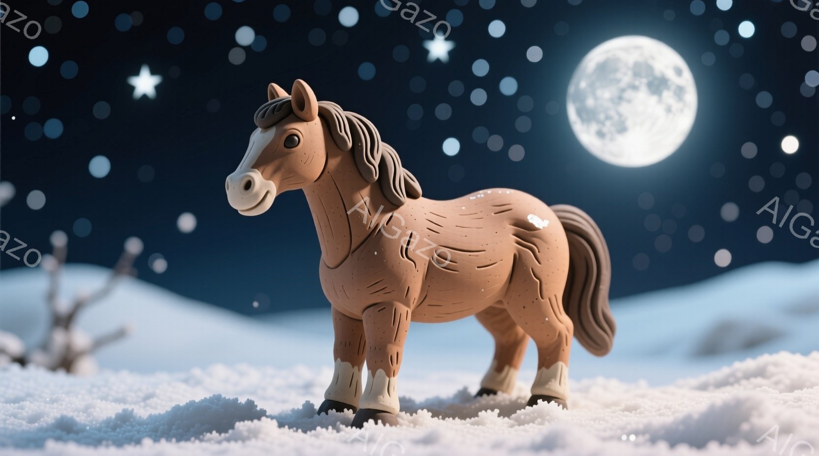 画像は雪に覆われた風景の中に、茶色の馬が立っている様子を描いています。馬は四肢の一部が白く、穏やかな表情でまっすぐ前を見つめています。背景には、雪に覆われた木々と満月が輝き、幻想的な冬の夜の雰囲気を醸し出しています。