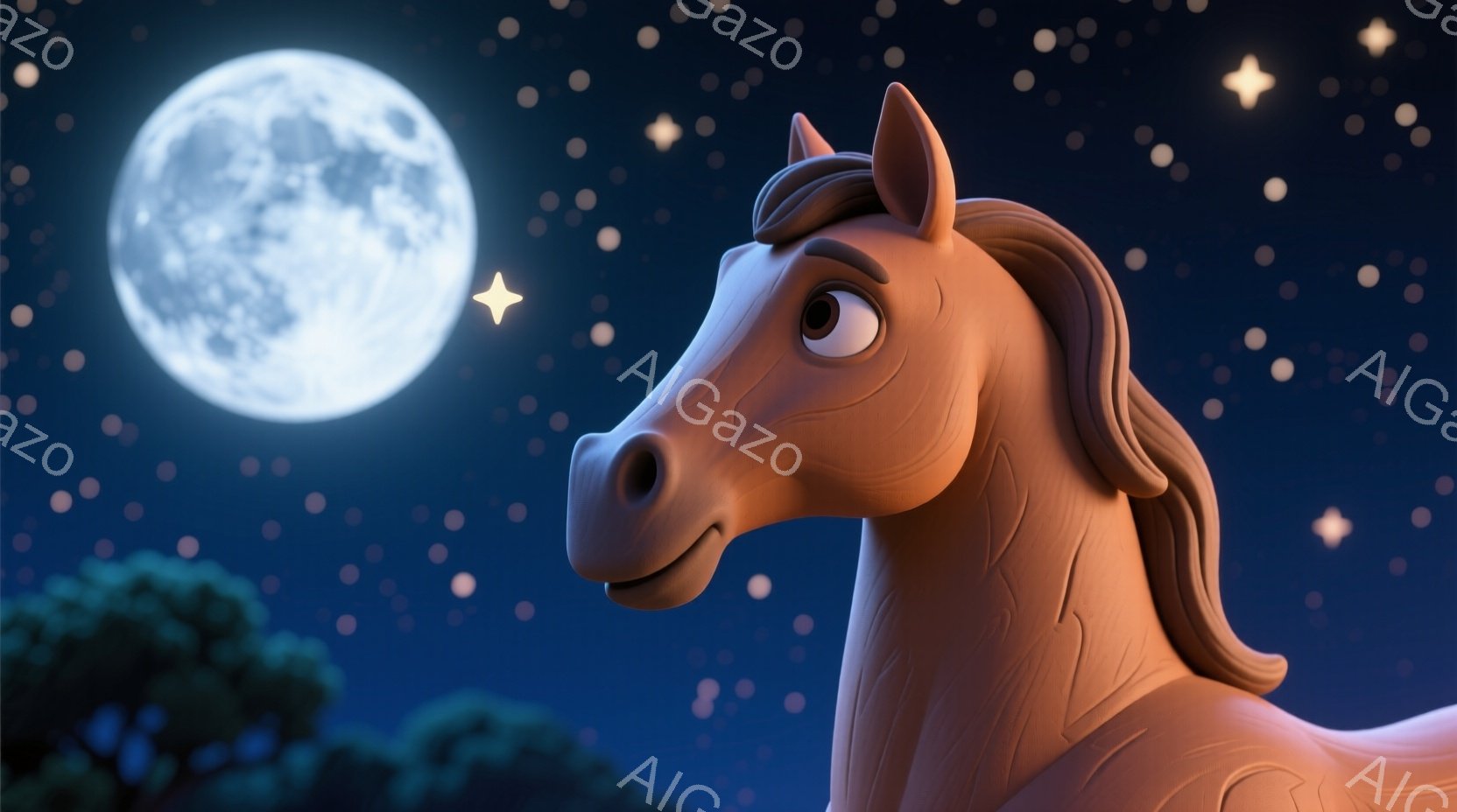 夜空を背景に、茶色の馬が描かれています。馬は右を向き、わずかに微笑んでいるように見え、その表情は穏やかで友好的です。背景には、明るい満月と無数の星が輝き、遠くにはシルエット状の丘や木々が見え、全体的に幻想的で平和な雰囲気を醸し出しています。