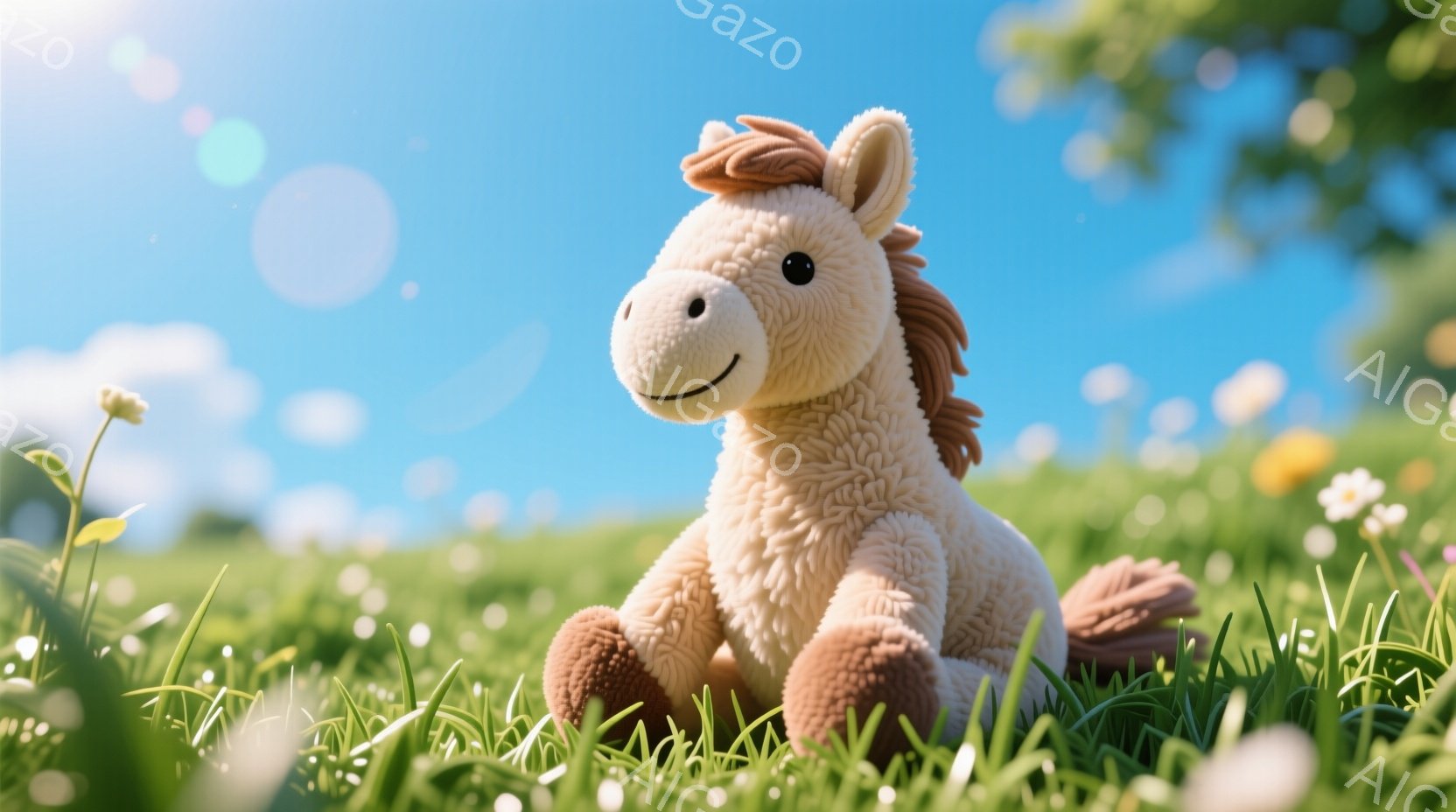 ふわふわのクリーム色の馬のぬいぐるみは、緑豊かな草の上に座っています。穏やかな表情で、少し微笑んでいるように見え、背景には青空と白い雲が広がり、暖かく優しい雰囲気を醸し出しています。白い花が点在する草原は、ぬいぐるみとの調和を生み出し、平和な春の日のような印象を与えます。