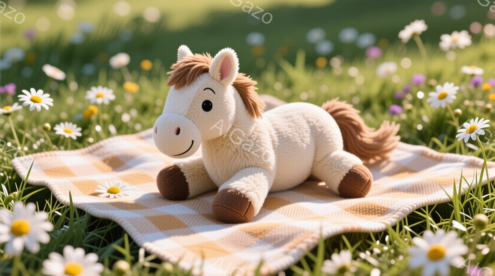 明るい草原に、クリーム色の毛並みの可愛いぬいぐるみ馬が横たわっています。茶色い格子柄の敷物の上に、リラックスした様子で横たわり、穏やかな表情をしています。周りには白い小さな花が咲き乱れ、暖かく優しい雰囲気を醸し出しています。