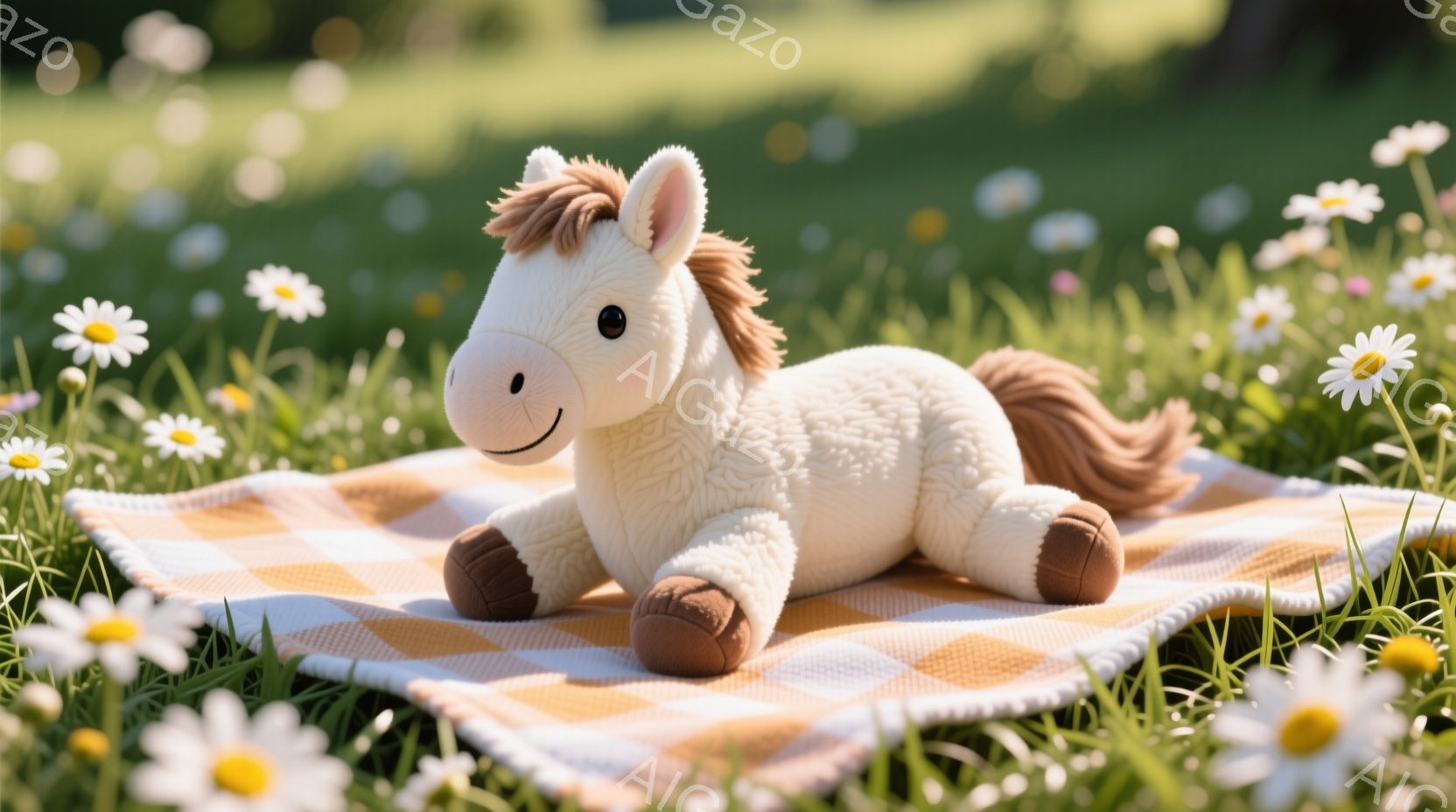 クリーム色のふわふわとしたテディベアの馬が、チェック柄の敷物の上に横たわっています。背景には白いデイジーが咲き乱れる緑の草原が広がり、穏やかで牧歌的な雰囲気を醸し出しています。柔らかな光が全体を包み込み、暖かく心地よい印象を与えます。