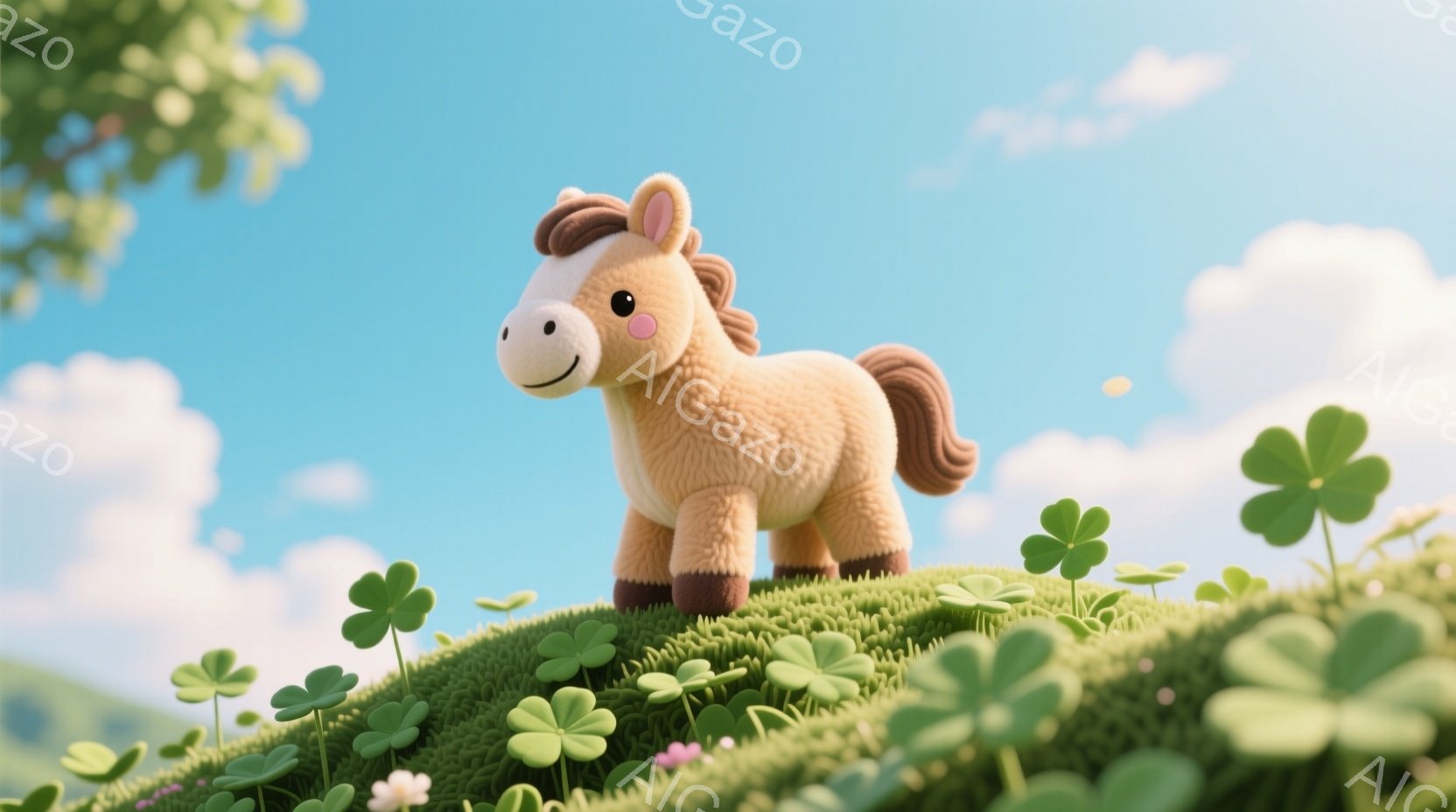 ふわふわの白い馬が、緑の丘の上に立っている。馬は茶色のたてがみと足を持ち、穏やかな笑顔を浮かべている。背景には青い空と白い雲、そしてクローバーや花が咲き乱れる、穏やかで平和な雰囲気の風景が広がっている。