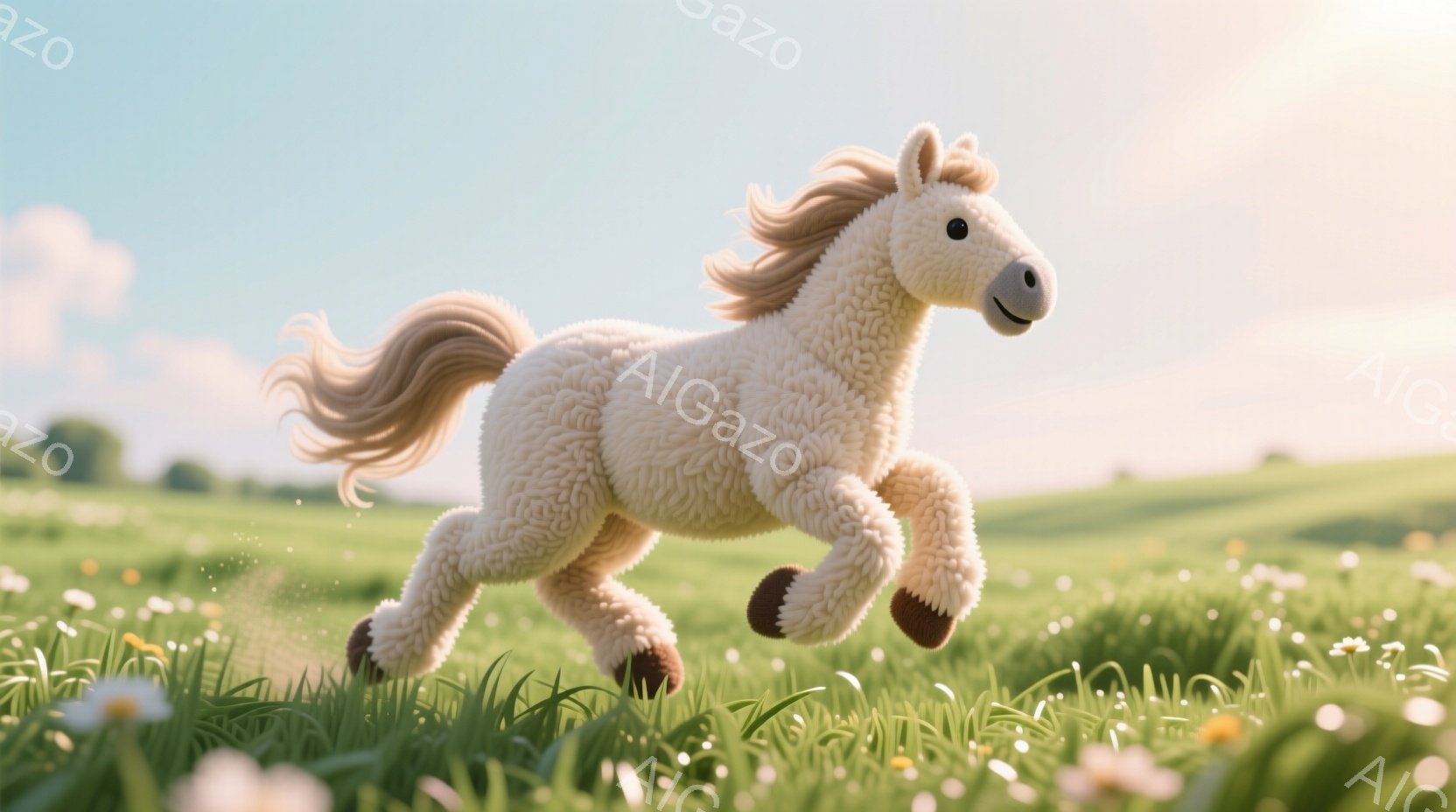 ふわふわとした白い毛並みのポニーが、緑豊かな草原を駆け抜けている。ポニーは茶色の蹄を持ち、たてがみと尾は風になびき、表情は明るく楽しげだ。背景には穏やかな丘と、ところどころに咲く花々が見え、晴天の下、暖かい雰囲気が漂っている。