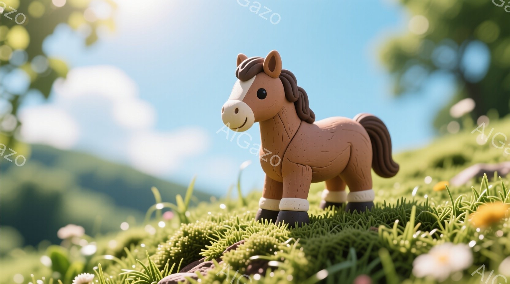 2頭の茶色の馬が、花畑の中で正面を向き合っています。馬たちは白い足飾りをつけ、穏やかな表情をしています。背景には緑豊かな丘と木々が広がり、晴れた日の穏やかな雰囲気を醸し出しています。
