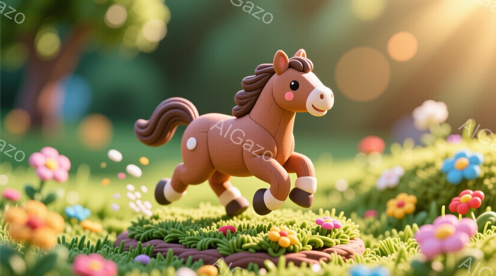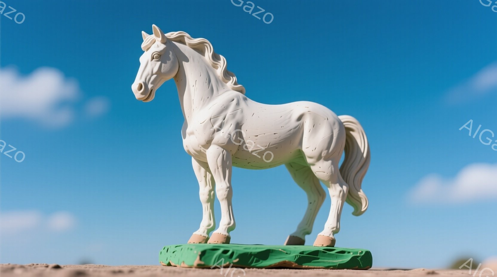 白い彫刻の馬が、緑色の台座の上に立っている。馬は正面を向き、穏やかで静止した姿勢をとっており、彫刻の表面は滑らかで、細部まで丁寧に作られているように見える。背景は晴れた青空とわずかに見える地形で、全体的に平和で穏やかな雰囲気を醸し出している。