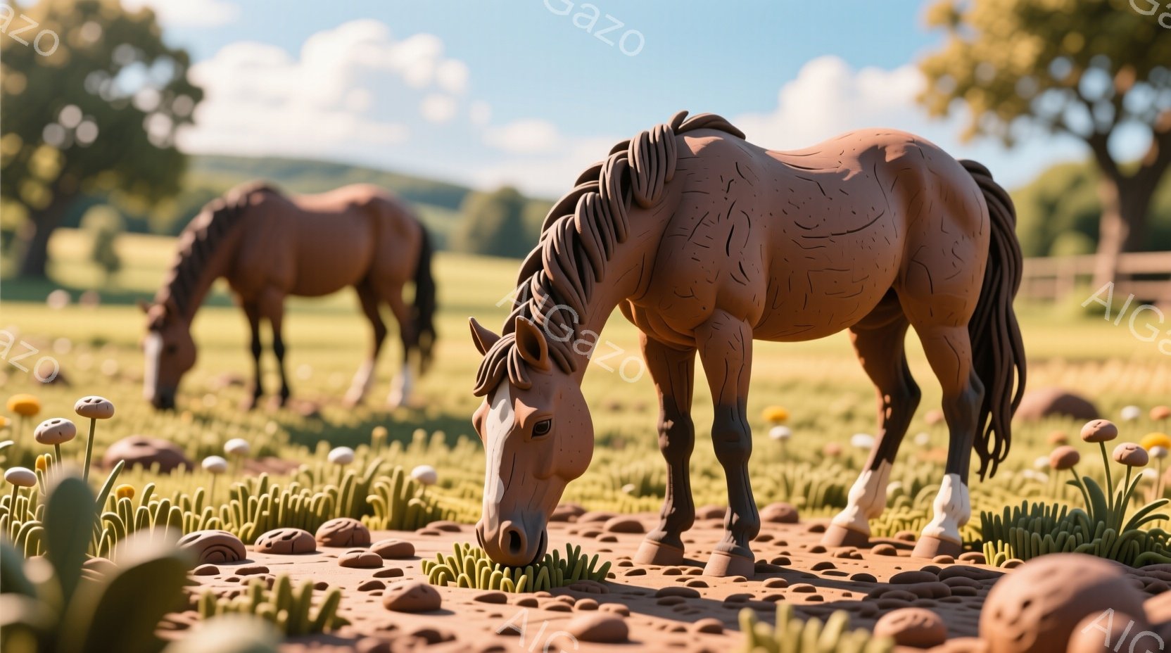 牧草地で二頭の馬が草を食んでいます。馬は茶色の粘土のような質感で表現され、まるで彫刻のような印象を与えます。背景には緑の丘と木々が見え、晴れた空の下、穏やかな雰囲気が漂っています。