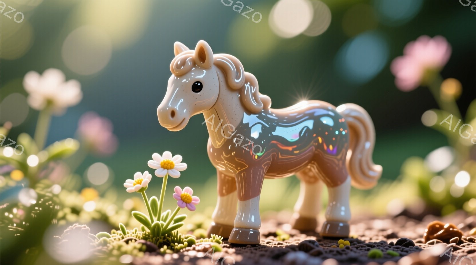 鮮やかな虹色に輝くユニコーンの置物が、緑豊かな草むらの上に静止している。周囲には小さな白いデイジーが咲き、背景はぼやけた緑色の自然で構成され、柔らかく幻想的な雰囲気を醸し出している。光のフレアが置物を照らし、まるで魔法のような世界観を表現している。