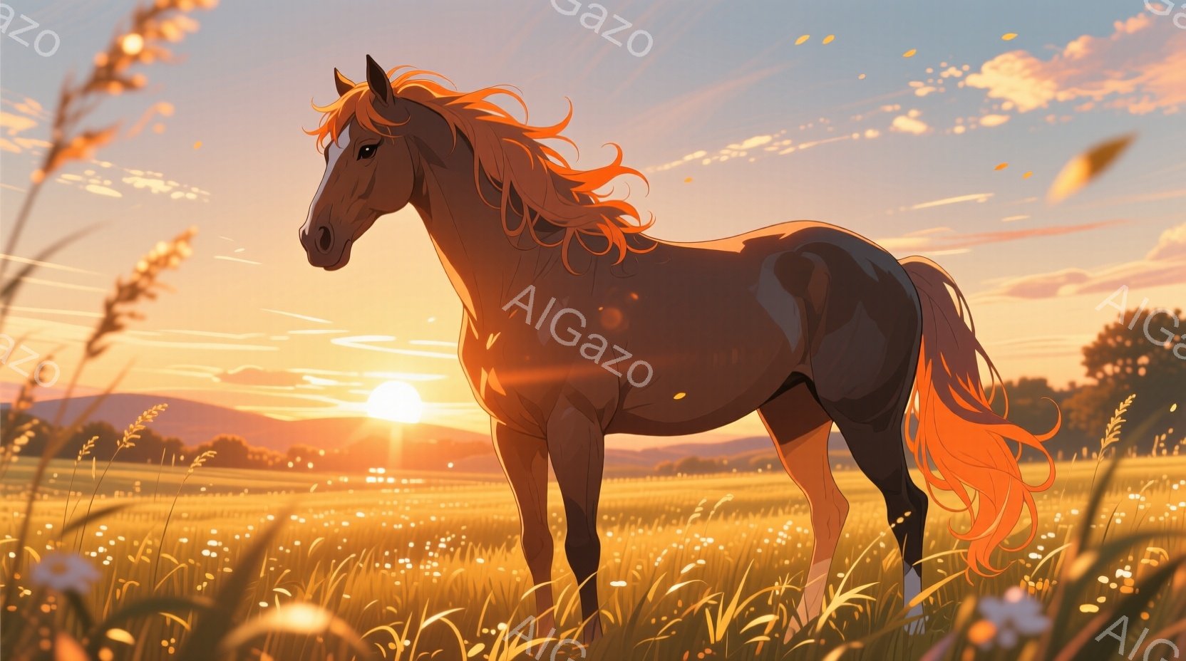夕焼けに照らされた茶色の馬が草原の中に立っている。馬のたてがみと尾は赤みがかったオレンジ色で、白く染まった足が特徴的だ。背景には緑の丘と木々、そして太陽が沈む空が広がり、温かく穏やかな雰囲気を醸し出している。