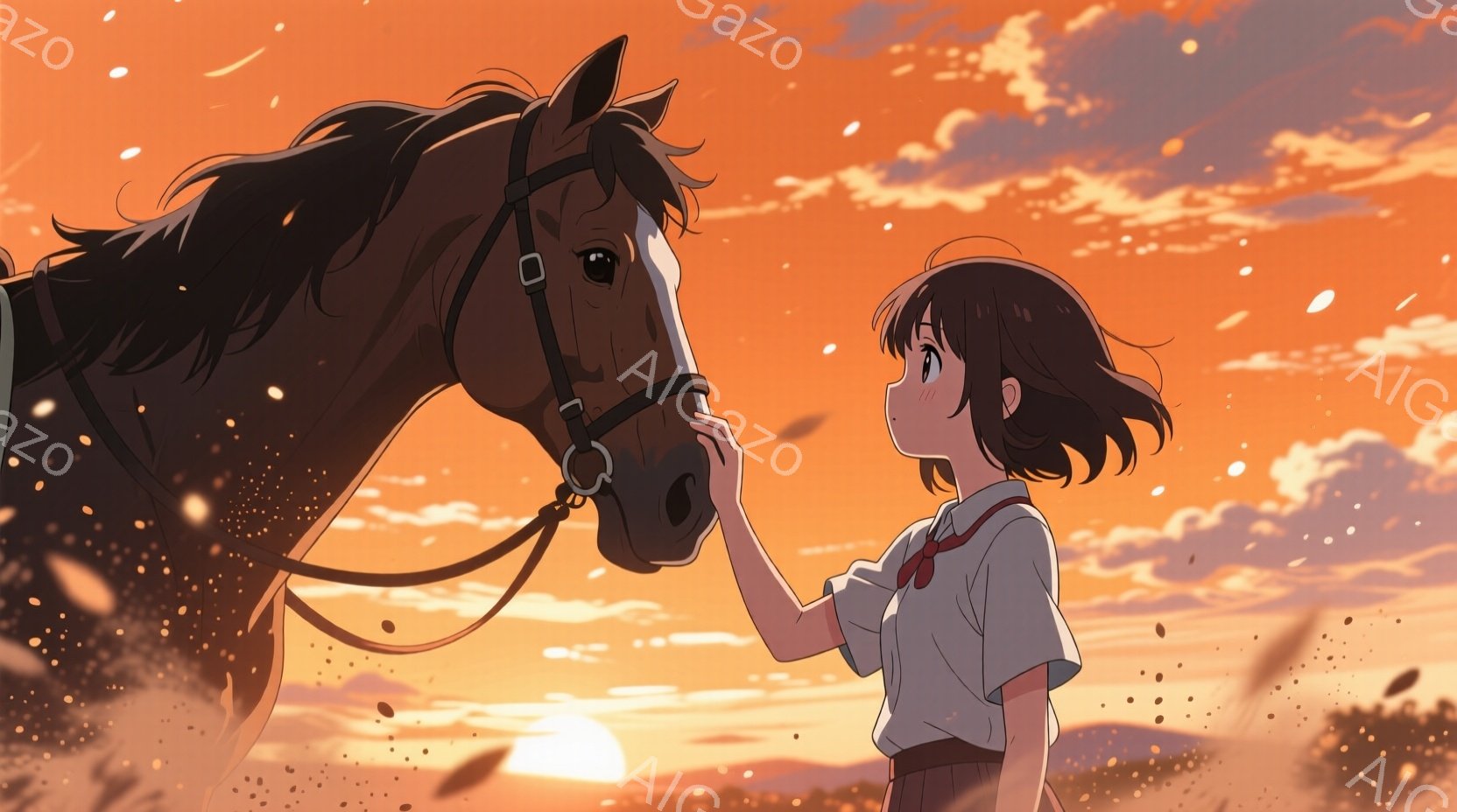 少女は制服姿で、栗色の馬の鼻に優しく触れている。背景は夕焼け空で、オレンジと赤のグラデーションが広がり、草原には風に揺れる草が描かれている。 全体的に温かく、穏やかな雰囲気が漂い、少女と馬の間に優しい絆が感じられる。