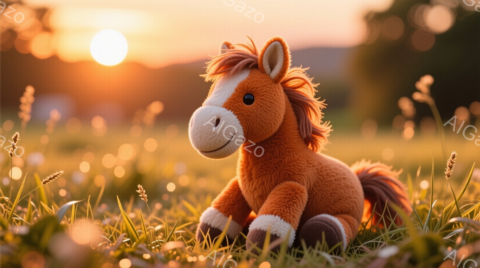 広大な草原で、栗毛の馬と白馬が並んで立っている。背景には、木々やフェンスが見え、夕焼けのような暖かなオレンジ色の光が草原全体を照らしている。花々が咲き乱れる草原と、穏やかな空気が、静かで平和な雰囲気を醸し出している。