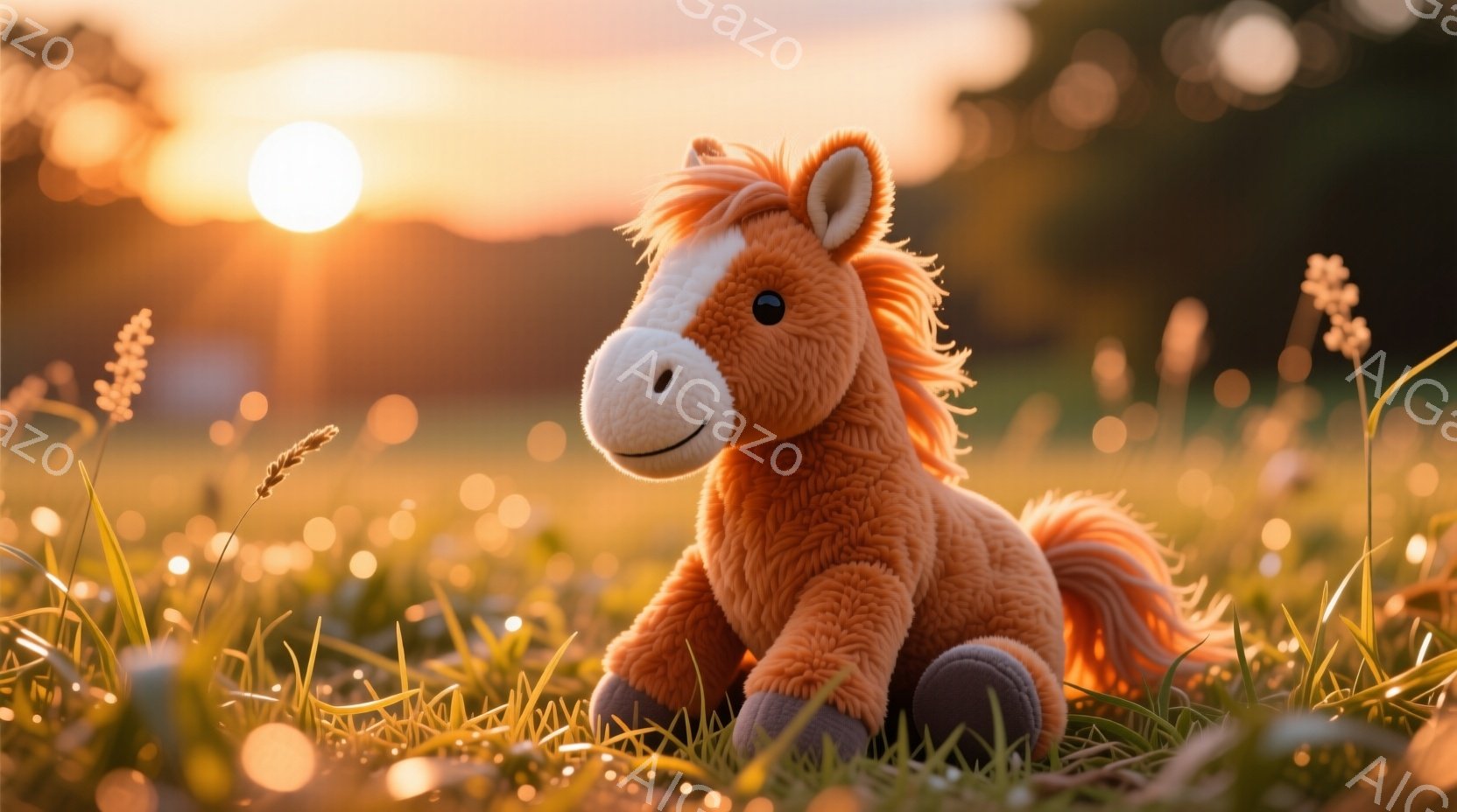 明るいオレンジ色の毛並みを持つ、柔らかい質感のぬいぐるみ馬が、緑豊かな草むらに座っています。背景には、夕焼けの暖かな光が差し込み、草の葉と小麦色の穂がぼんやりと光を反射しています。全体的に、穏やかで平和な雰囲気であり、夕暮れ時の優しい光が、暖かく心地よい印象を与えます。