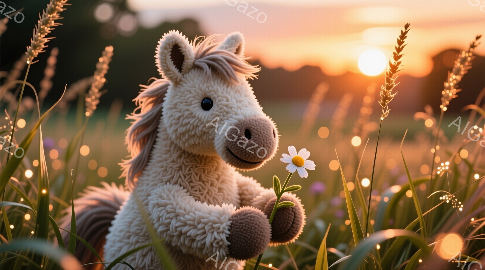 ふわふわとした白い馬のぬいぐるみは、花畑の中で片手に白い花を抱えています。表情は穏やかで微笑んでおり、背景には夕焼けに照らされた草原が広がり、暖かく優しい雰囲気を醸し出しています。太陽の光が草を照らし、幻想的な光景を作り出しています。