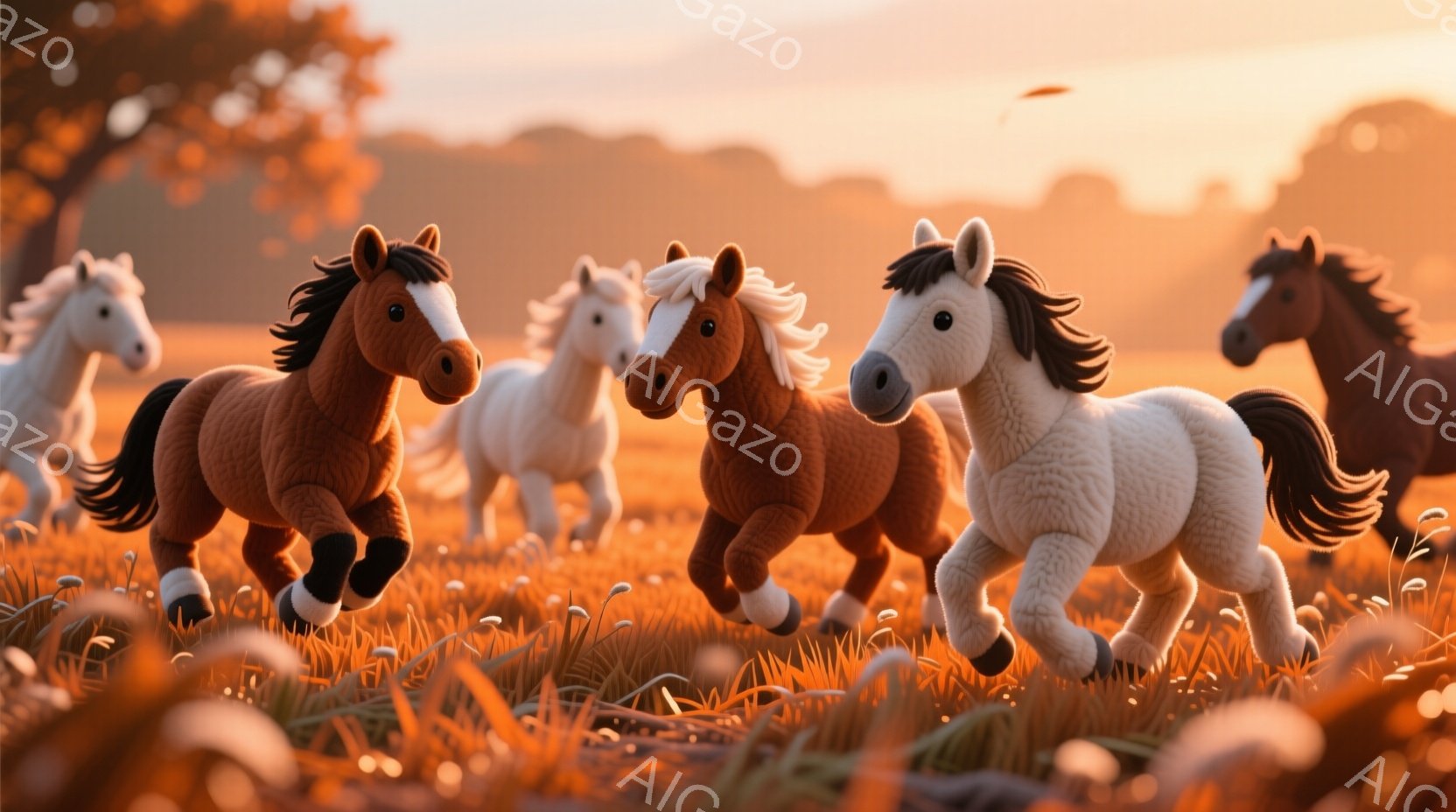 広大な草原を複数の馬が駆け抜けている様子が描かれています。夕暮れ時の暖かくオレンジ色の光が草原を照らし、馬たちは活気に満ちた姿勢で疾走しています。背景には穏やかな丘陵地帯が見え、全体的に安らかで牧歌的な雰囲気が漂っています。