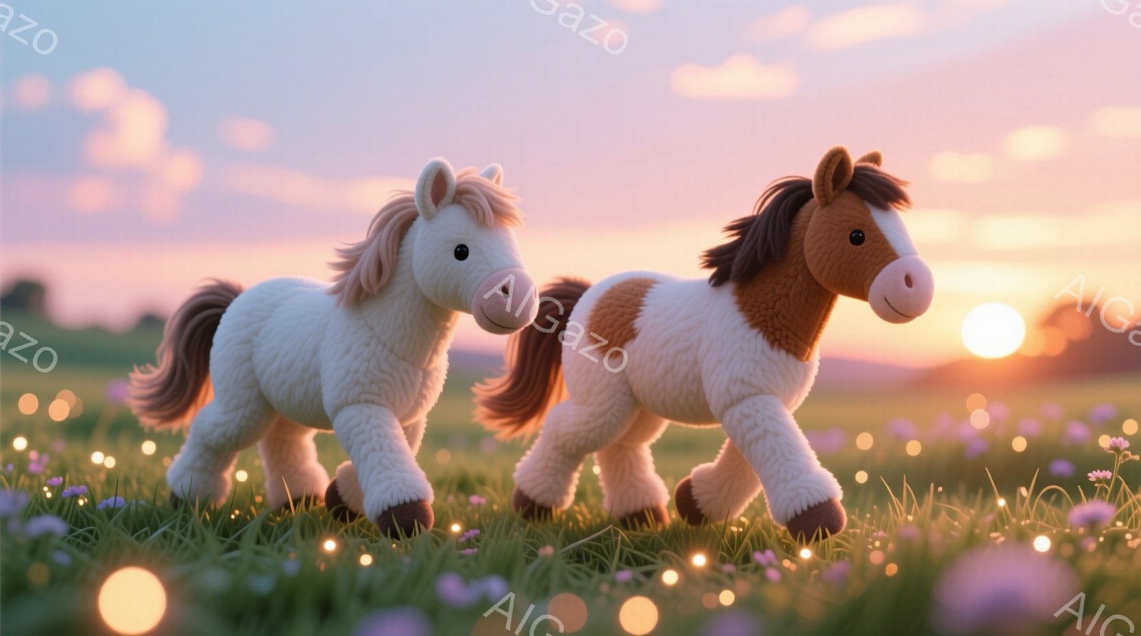 ふわふわとした毛並みの白い馬と、茶色の馬が草むらの中を駆けている。背景には穏やかな夕焼け空が広がり、草原には小さな花々が咲き乱れている。全体的に暖かく、穏やかな雰囲気で、まるで絵本の世界のような可愛らしい光景である。