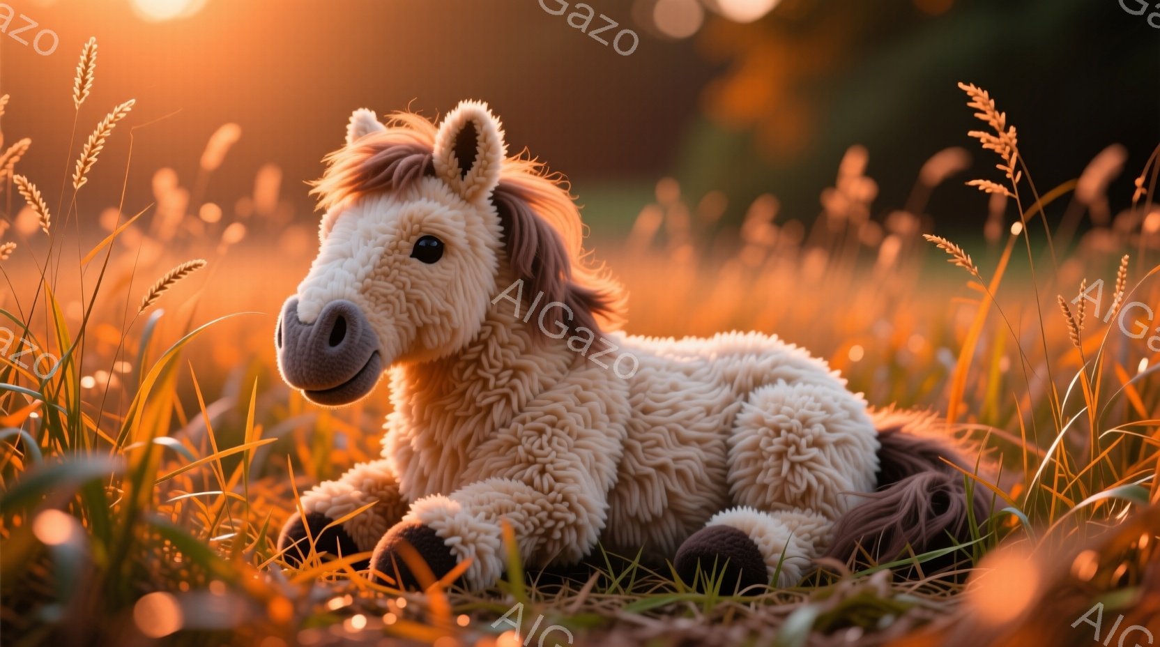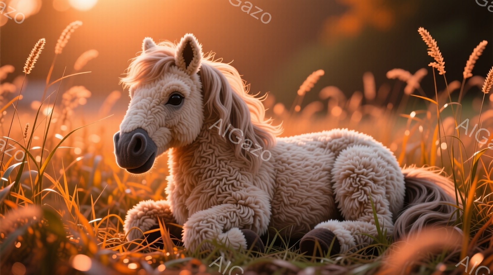 白い毛並みの、ふわふわとしたテディベアのような馬が、黄金色の野原に横たわっています。暖かく柔らかな光が差し込み、周囲の草を輝かせ、穏やかで幻想的な雰囲気を醸し出しています。馬の表情は穏やかで、リラックスした時間が流れているようです。