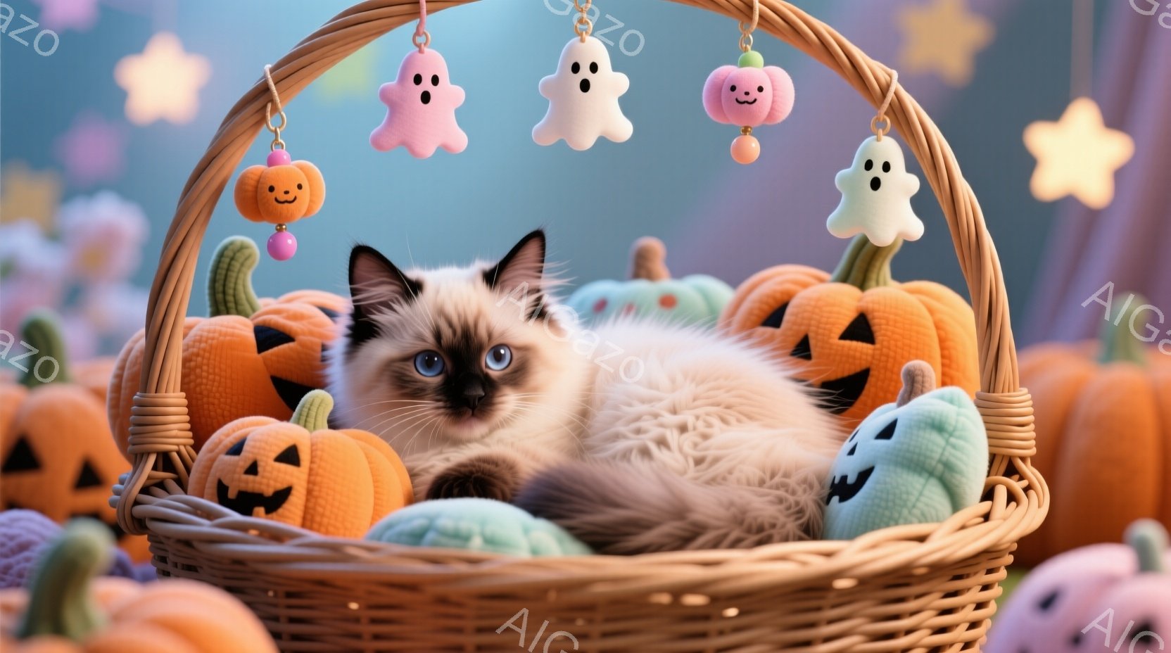 白い毛並みと青い目を持ち、茶色の模様が入った子猫が、オレンジと水色のカボチャに囲まれた籐のバスケットの中で丸まって眠っています。背景には、淡いピンク色の花や、ハロウィーンの飾りがぼんやりと見え、全体的に暖かく、夢のような雰囲気が漂っています。カボチャと子猫の組み合わせは、秋の穏やかさと可愛らしさを表現しています。