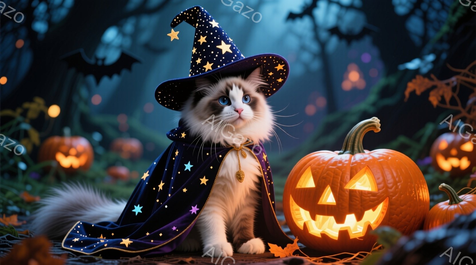 長毛の猫が魔女の帽子とマントを身につけ、微笑んでいます。背景にはジャック・オー・ランタンが複数配置され、遠くにシルエットで城が見え、落ち葉が散らばっています。全体的にハロウィーンの夜の神秘的で楽しい雰囲気が漂っています。