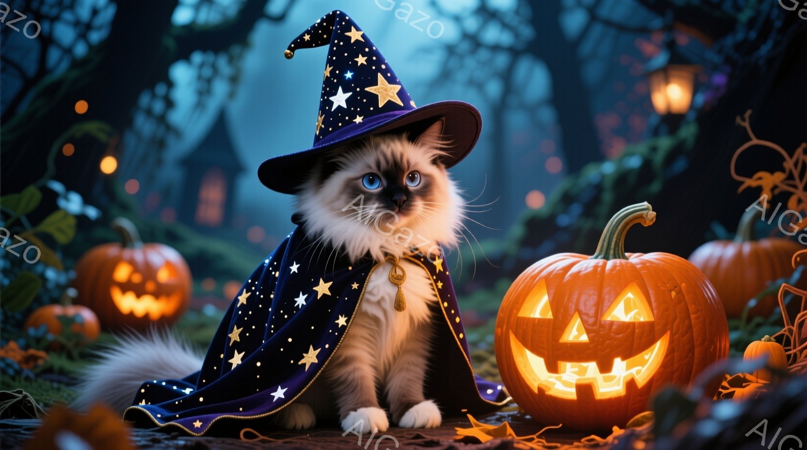 白と茶色の毛並みを持つ子猫が、星柄の黒い魔法使いの衣装と帽子を身に着け、正面を見つめている。背景には、ハロウィーンのランタンとして彫られた光るカボチャがいくつかあり、落ち葉と暗い森が広がっている。 全体的に、ハロウィーンの夜に可愛らしい子猫が魔法使いに扮している、幻想的で温かい雰囲気の画像である。