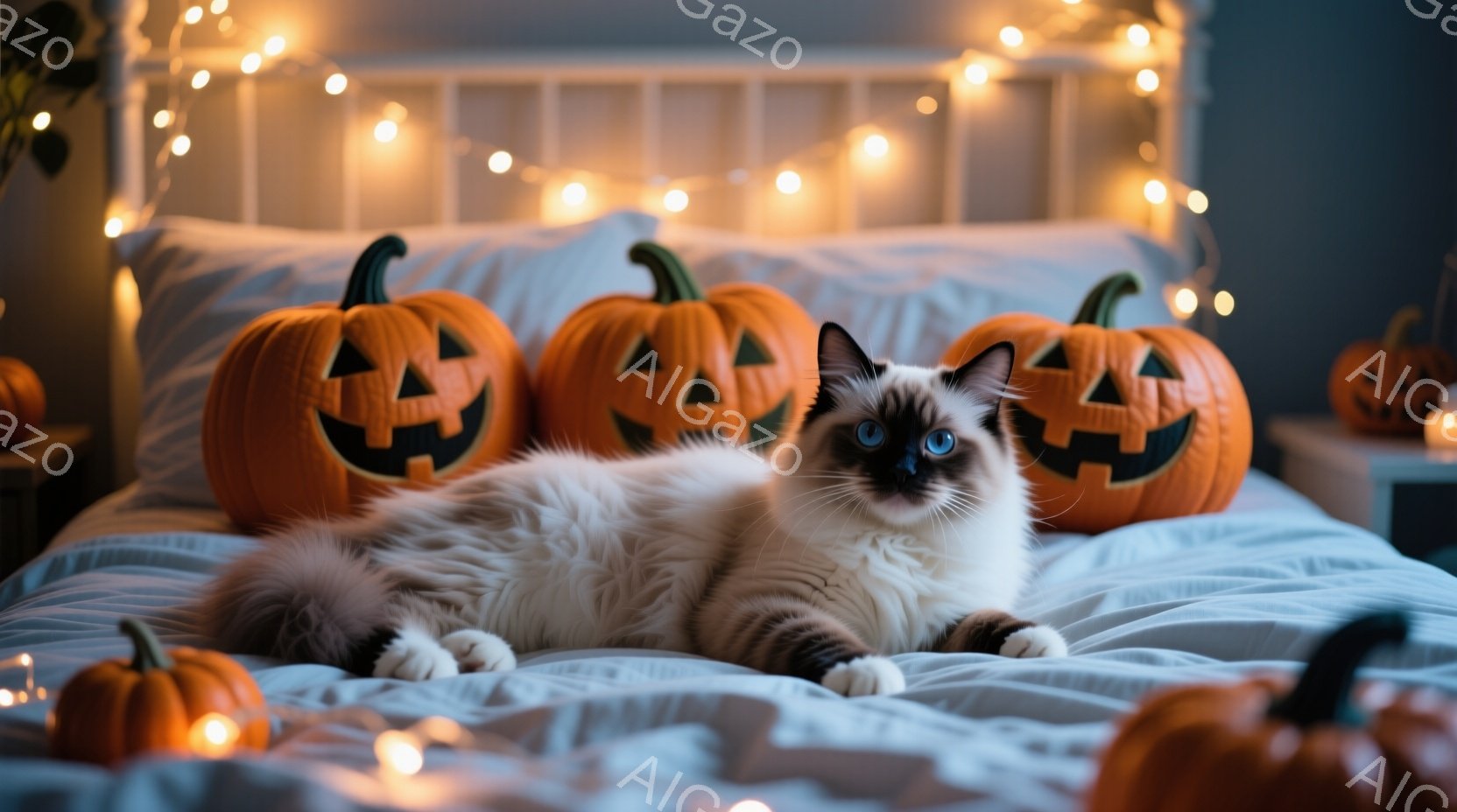 白い毛並みの美しい猫が、ハロウィーンの飾りであるオレンジ色のジャック・オ・ランタンが並んだベッドに横たわっています。猫は青い瞳でこちらを見つめ、リラックスした様子で優雅な姿勢を保っています。ベッドの背景には、ぼんやりと見える家具と、暖色系のイルミネーションが飾られ、温かく幻想的な雰囲気を醸し出しています。