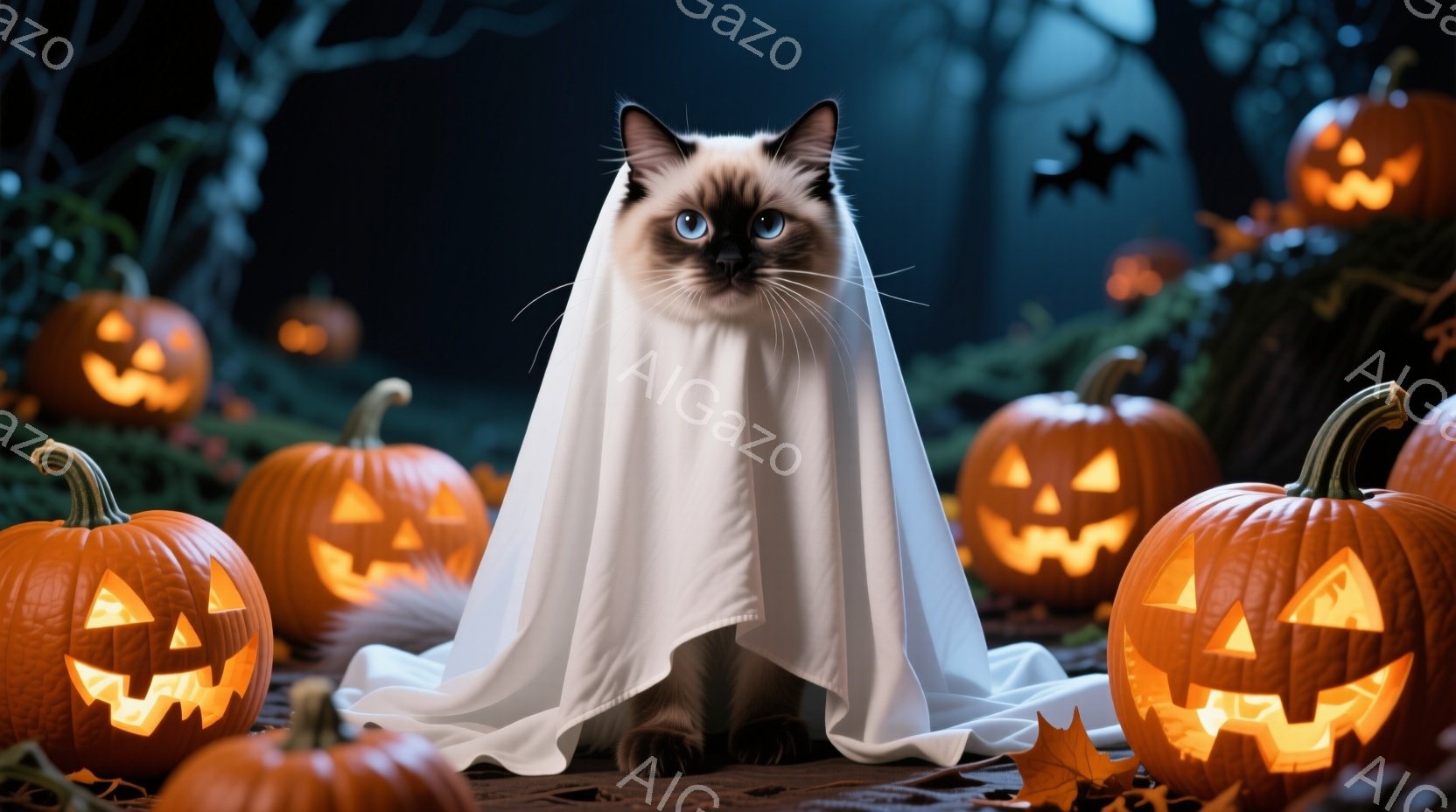 白い毛並みの猫が三匹、ハロウィーンの装飾と共に写っています。左の猫はカボチャの隣に座り、真ん中の猫は魔女の帽子をかぶり、右の猫はタキシードとマントを身に着けています。背景にはオレンジ色のガーランド、カボチャのランタン、そして暗い木々のシルエットが見られ、全体的にハロウィーンの楽しい雰囲気を醸し出しています。