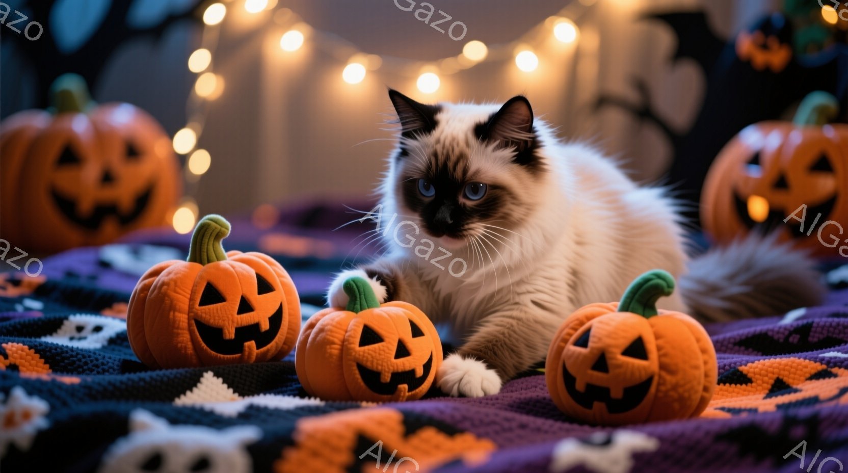 白い毛並みにポイントカラーが入った美しい猫が、ハロウィーンの装飾に囲まれてリラックスして横たわっています。オレンジと紫のチェック柄の布の上に、様々な大きさのジャック・オー・ランタンのぬいぐるみが置かれ、背景にはぼんやりとハロウィーンらしい装飾が見えます。暖色系の照明と装飾が、猫の優雅さとハロウィーンの楽しい雰囲気を引き立てています。