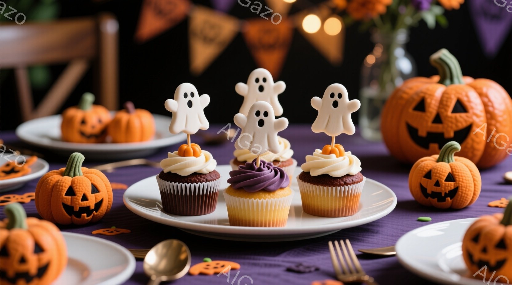 シーマ猫がハロウィーンの帽子と蝶ネクタイを身に着けて、カメラの正面を見つめている。背景には、紫とピンクの風船が浮かび、可愛いお化けの形をしたライトが点在している。全体的に、ハロウィーンの楽しい雰囲気を醸し出している。