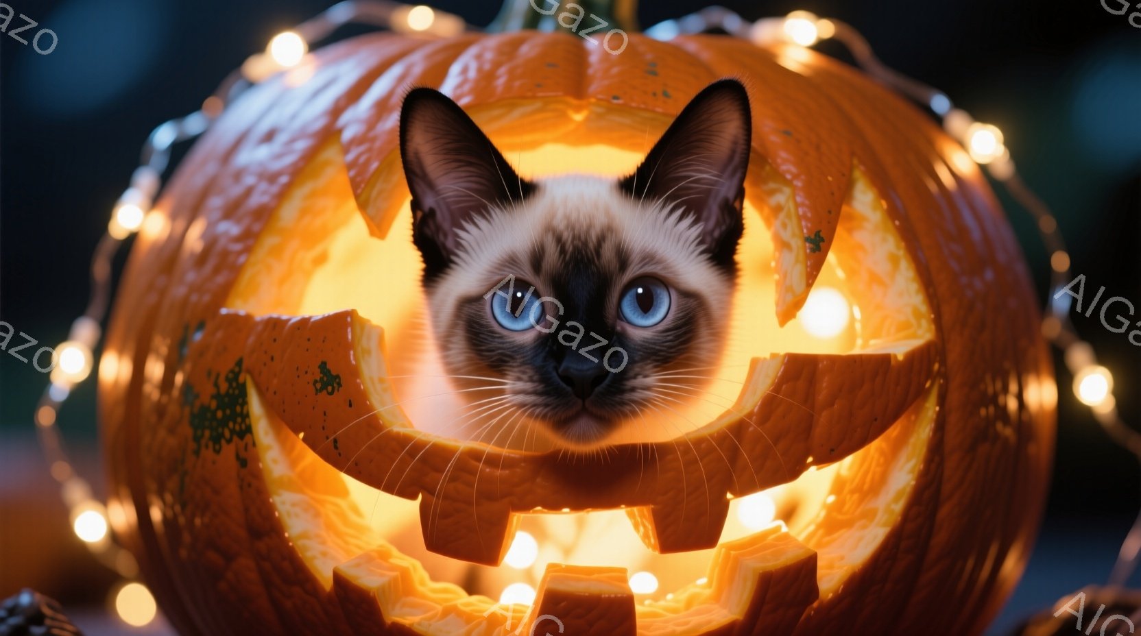 シーマ猫が、ハロウィーンのくり抜かれたカボチャの中に顔を出しています。その猫は青い目をしており、少し驚いたような表情で正面を見ています。背景には、ぼんやりと光る電飾があり、全体的に温かく、お祝いムードの漂う雰囲気です。