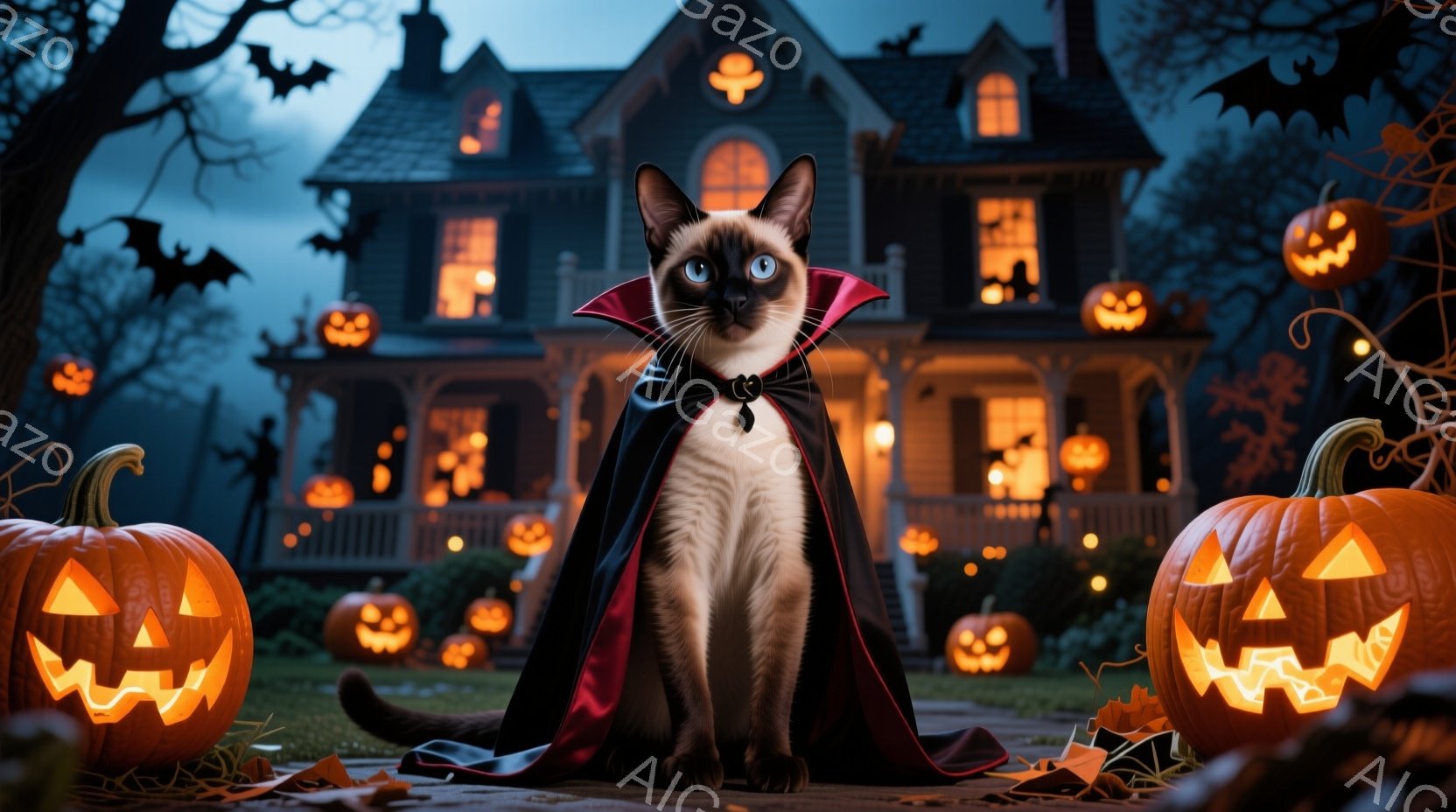 シベリアンハスキーのような毛並みの猫が、黒いマントと赤い襟を身に着けて正面を向いています。背景には、ジャック・オー・ランタンで飾られた、薄暗く不気味な屋敷と、木々が生い茂る夜の風景が広がっています。全体的にハロウィーンの夜を思わせる、幻想的で少し不気味な雰囲気が漂っています。