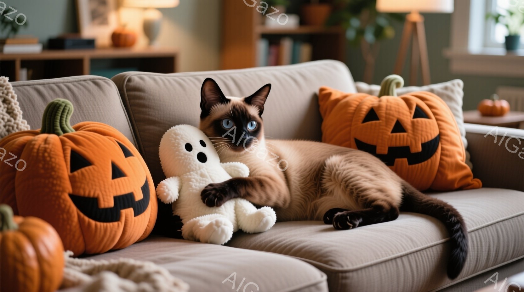 ソファに横たわるシャム猫が、ハロウィーンの装飾と共におとなしい雰囲気を醸し出しています。猫は片足を白いゴーストのぬいぐるみの上に置き、リラックスした表情でカメラを見つめています。背景には、ハロウィーンの飾り付けが施されたコーヒーテーブルと、柔らかな光が差し込む窓が見え、温かく穏やかな雰囲気を演出しています。